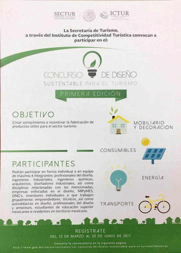 05 de Mayo del 2017-. La Secretaría de Turismo, a través del Instituto de Competitividad Turística, convoca a participar en el Concurso Nacional de Diseño Sustentable para el Turismo, en su primera edición, con el objetivo de crear e incentivar la fabricación de productos útiles para el sector.