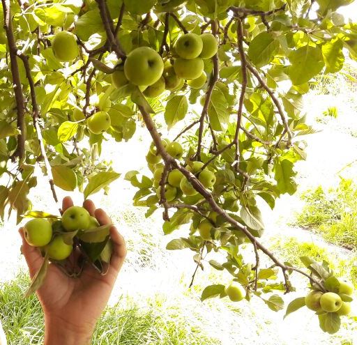 A lo lejos alcanzo a ver el árbol de manzanas que toda la mañana había ocupado mi mente, pensando en si tendría frutos o nos pasaría lo mismo que en Chavarria nuevo, aunque si no hubiera tenido, ya contaba con un plan ”c“ rumbo a un poblado llamado El Mil Diez. Conforme nos acercabamos, el árbol cargado de manzanas iba tomando forma, con sus ramas agachadas de tanta carga. Que emoción, nuestro árbol estaba repleto de pequeñas manzanas verdes.