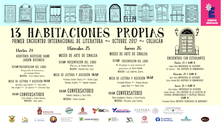 24 de Octubre del 2017.- En el marco del Festival Cultural Sinaloa 2017, la actividad literaria también tiene un espacio, con la realización del Primer Encuentro Internacional de Literatura: 13 Habitaciones Propias, que se celebrará del martes 24 al jueves 26 en Culiacán y Mazatlán, con la presencia de 13 escritoras invitadas de México, España y Venezuela, y 5 de Sinaloa, quienes participarán en mesas redondas, presentaciones de libros y encuentros con universitarios.