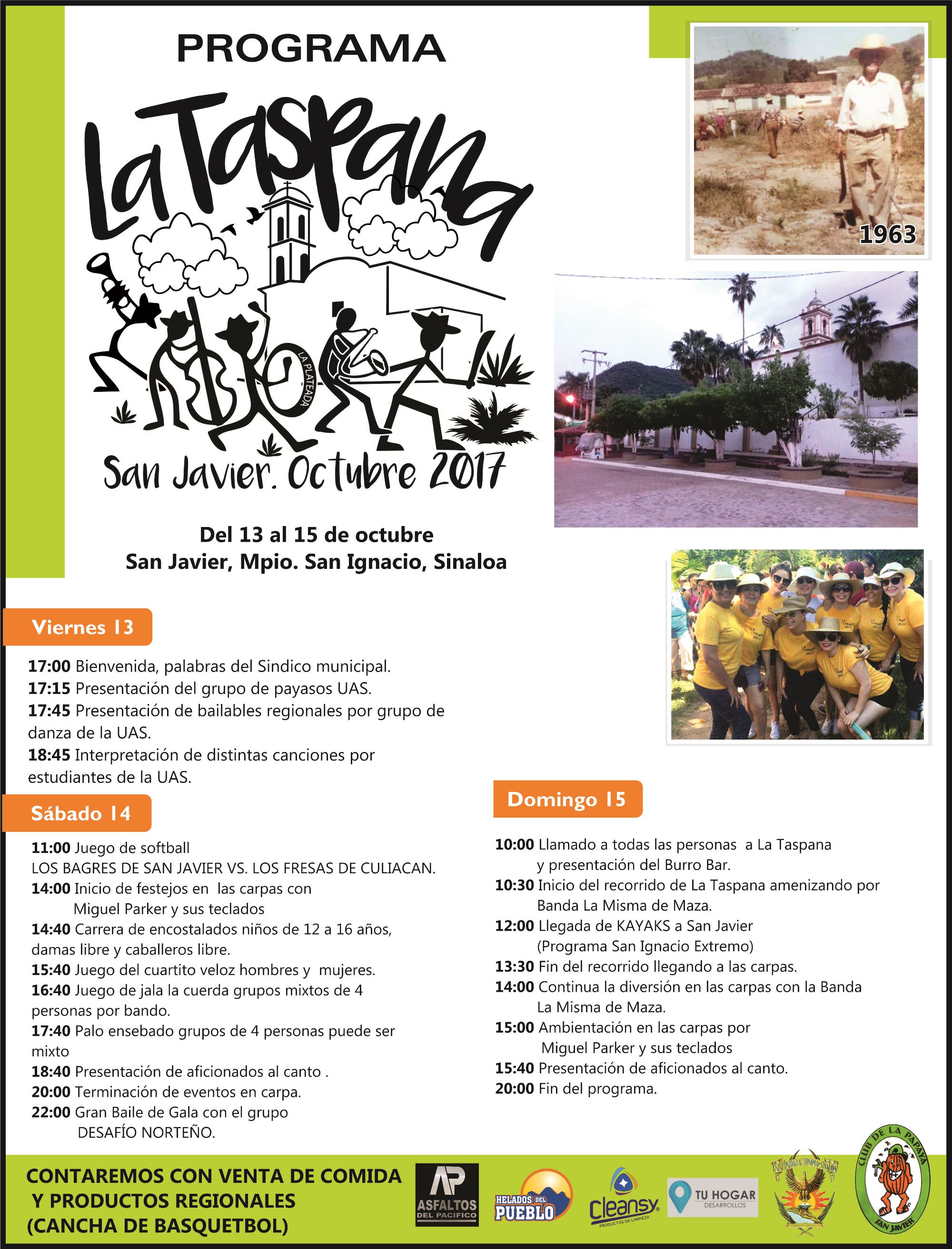 El próximo 15 de octubre, como cada año, los sanjaviereños y visitantes vivirán de nuevo la Festividad de la Taspana, alegre tradición con más de 150 años de antigüedad, iniciándose con la familia Bolado y Vicente Zazueta, donde el objetivo solo era el de limpiar de maleza las calles del pueblo después de la temporada de lluvias.
