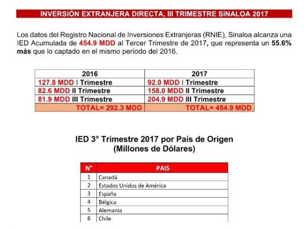 Culiacán, Sinaloa; a 27 de noviembre de 2017.- Al cierre del tercer trimestre del 2017, Sinaloa registró un incremento del 55.6 por ciento, en comparación del mismo periodo del año pasado en materia de inversión extranjera directa, al acumular 454.9 millones de dólares (unos 8 mil 400 millones de pesos), lo que muestra positivos niveles de confianza, certeza y condiciones de competitividad en la entidad.