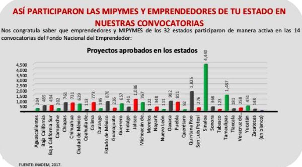 Culiacán, Sinaloa, México, a; 8 de Febrero de 2018.- Sinaloa ocupó el primer lugar en proyectos aprobados del el Fondo Nacional del Emprendedor de la Secretaría de Economía durante el 2017, superando por mucho al resto de los estados.