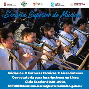 La Escuela Superior de Música convoca a todos los niños y jóvenes interesados en realizar estudios musicales, a inscribirse a cualquiera de sus 3 niveles educativos: Iniciación musical, Técnico y Licenciatura, en un proceso en línea en el que recibirán atención e información durante la emergencia sanitaria únicamente por el correo electrónico: ariana.lucero@culturasinaloa.gob.mx .
