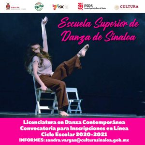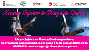 A su vez, la Escuela Superior de Danza de Sinaloa – en Culiacán- invita a todos los jóvenes interesados en realizar estudios de nivel superior en danza contemporánea, a inscribirse en línea para la Licenciatura en Danza Contemporánea, para lo cual pueden solicitar información al correo sandra.vargas@culturasinaloa.gob.mx .