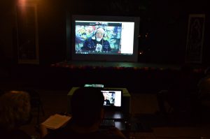 La charla comenzó con la muestra en video, tanto en la transmisión en vivo en Facebook como para los asistentes, de los procesos de la xilografía, mientras la directora explicaba que primero se debía entintar, para luego pasar con un rodillo la tinta en la madera y después ponerla en el piso, con varias personas involucradas y con sumo cuidado, para que el vehículo aplanadora pasara sobre la obra y se plasmara en el papel, mismo que se expone en la sala Carlos Bueno. Un total de 26 artistas participaron con sus tallados de madera e impresión de xilografía.