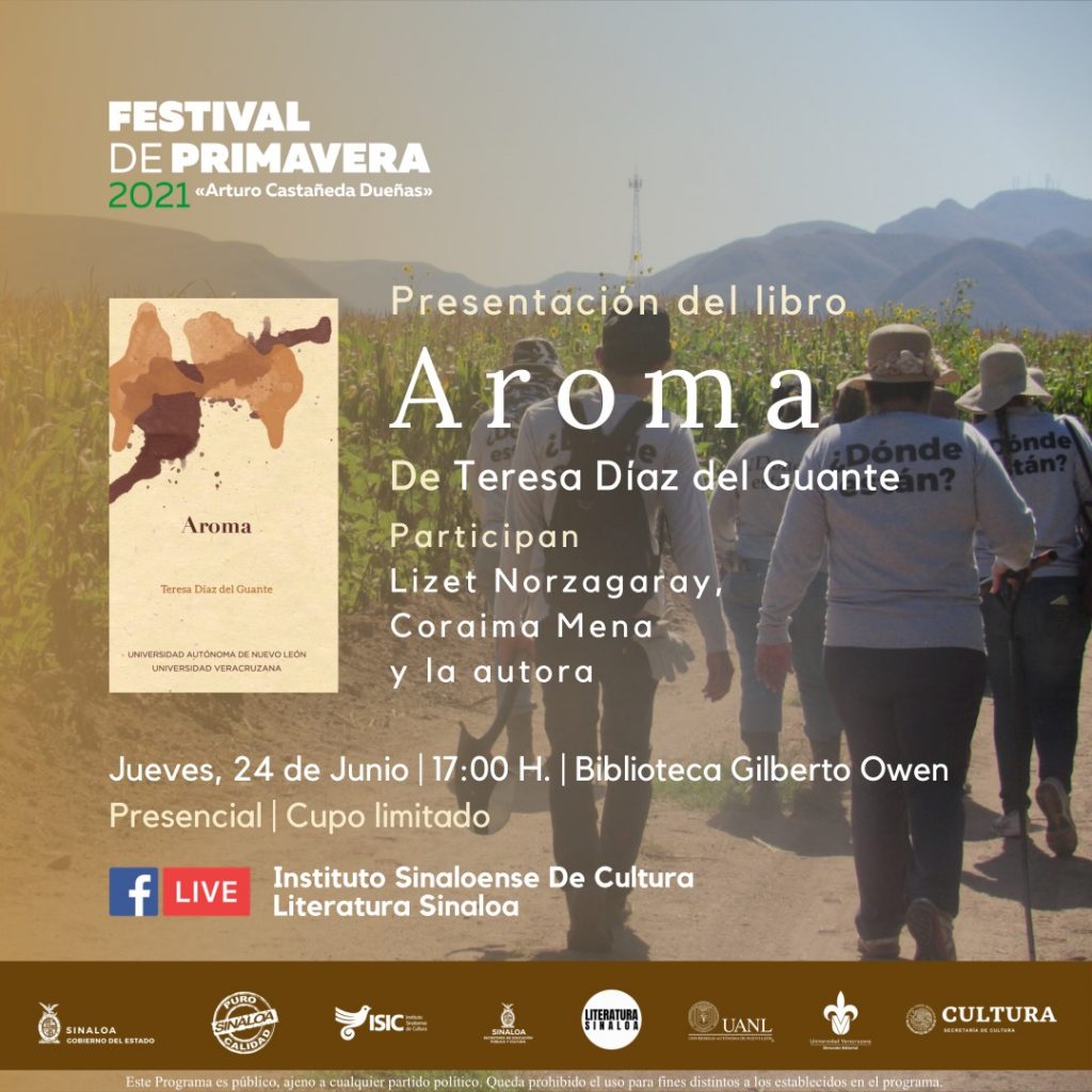 Culiacán, Sin.- Este jueves 24 a las 17:00 horas (tiempo del Pacífico), el Instituto Sinaloense de Cultura a través de la Dirección de Literatura, Publicaciones y Bibliotecas presenta el libro “Aroma”, de Teresa Díaz del Guante, en un acto que se llevará a cabo en forma presencial con cupo limitado, en la Biblioteca Pública Estatal Gilberto Owen, con la participación de Lizet Norzagaray, Coraima Mena y la autora.
