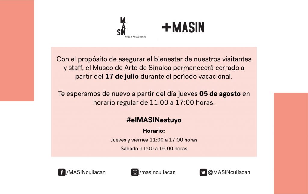 Culiacán, Sin.-  El Instituto Sinaloense de Cultura, a través del Museo de Arte de Sinaloa, anuncia el receso vacacional de este inmueble, a partir del sábado 17 de julio, con el propósito de asegurar el bienestar de los visitantes y del staff operativo ante la alza de contagios por la SARS COVID – 19, de Arte de Sinaloa.