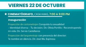 Inicia este viernes 22 de octubre a partir de las 19:00 horas, en Casa Haas con el protocolo de inauguración, para continuar con la proyección del cortometraje “Conquista tu sexualidad” y “Reconstruyendo mi vida”. Posteriormente en presencia del director José Ma. Espinosa se compartirá el largometraje “Te nombre en silencio”.