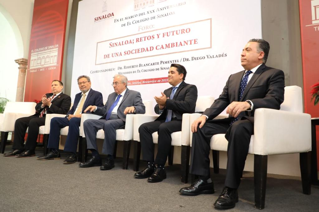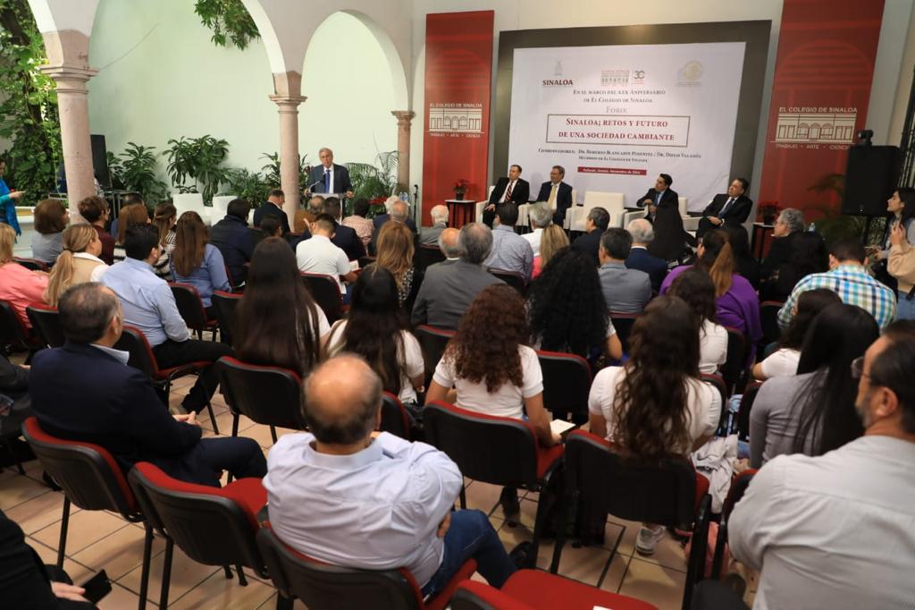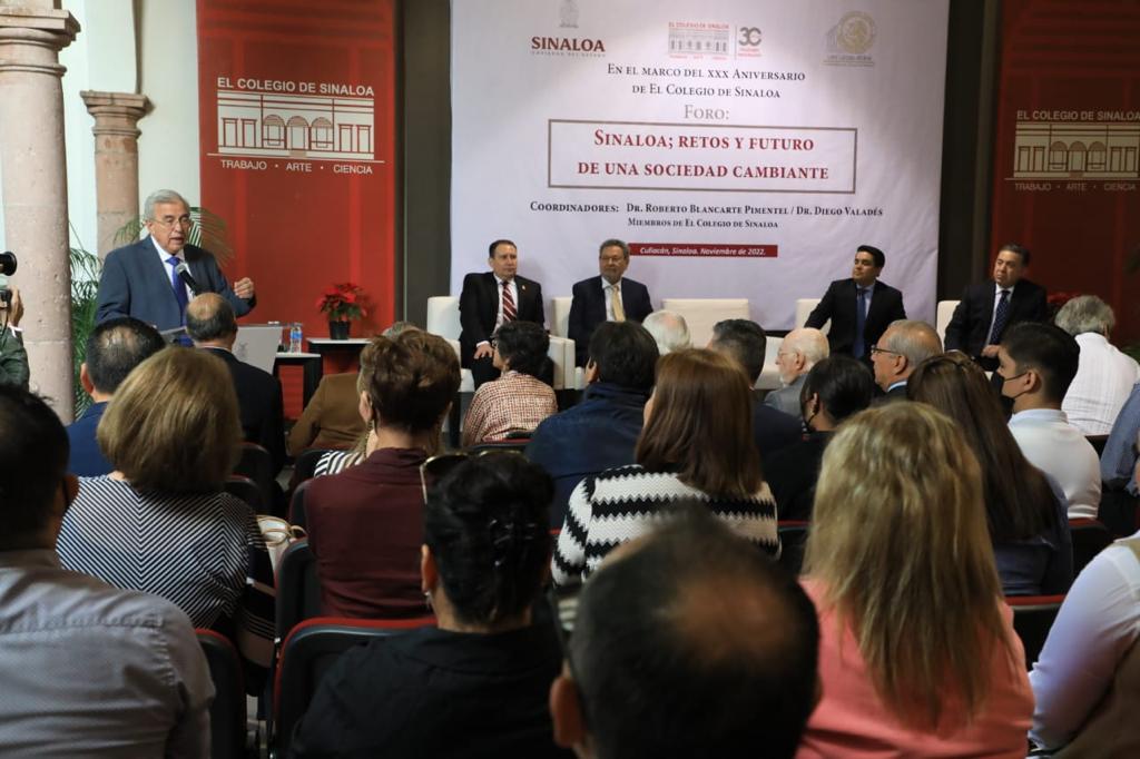 Culiacán, Sinaloa, a 23 de Noviembre de 2022.- En sintonía con la política de colaboración institucional con los distintos sectores de la sociedad, esta mañana, el Gobernador Rubén Rocha Moya, inauguró el Foro “Sinaloa; retos y futuro de una sociedad cambiante”, organizado por el Colegio de Sinaloa en el marco de su XXX Aniversario, ante la presencia de destacados académicos, legisladores, personal docente y colaboradores del ámbito educativo, encabezados por Élmer Mendoza Valenzuela, Presidente del Colegio.