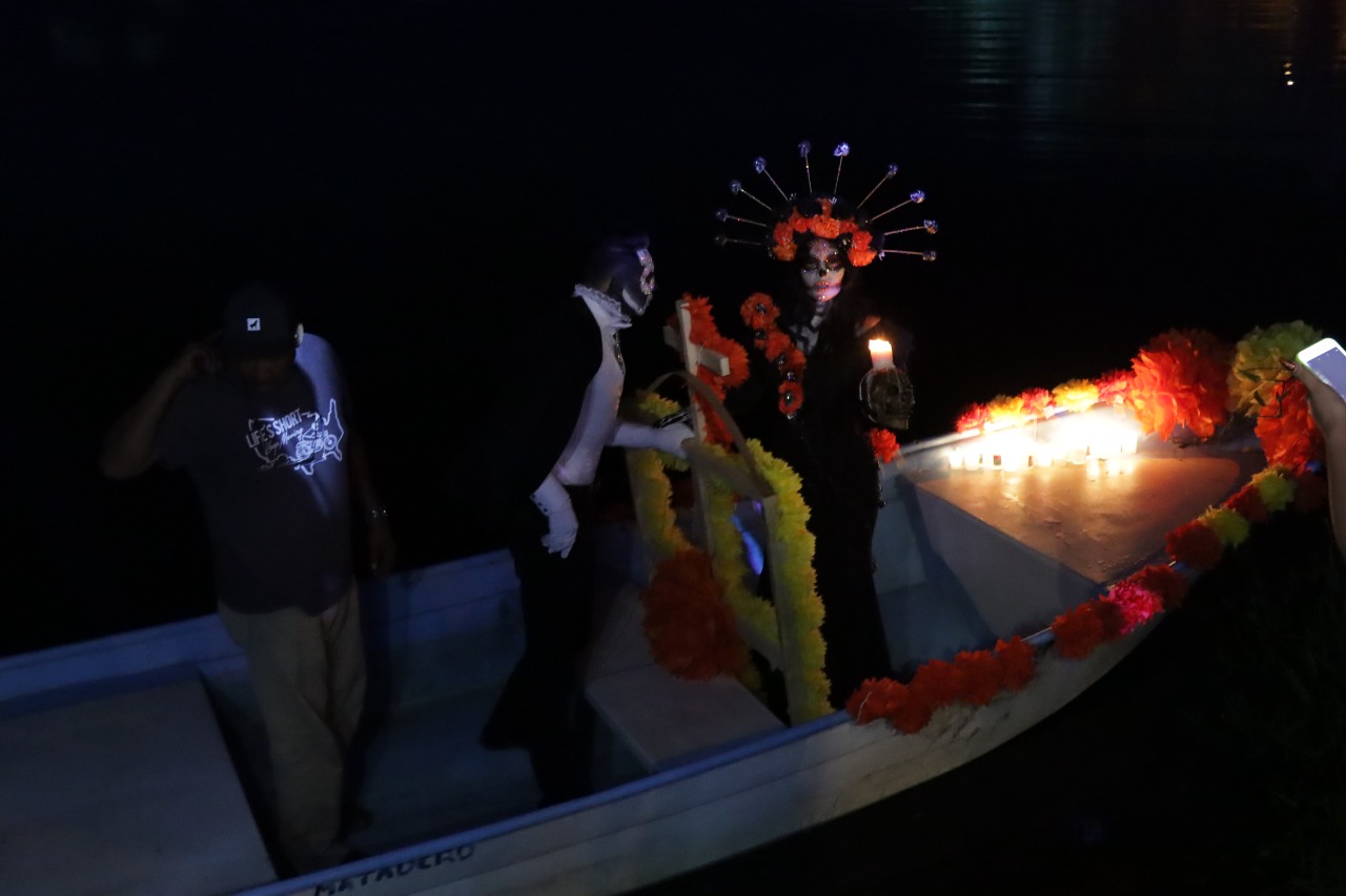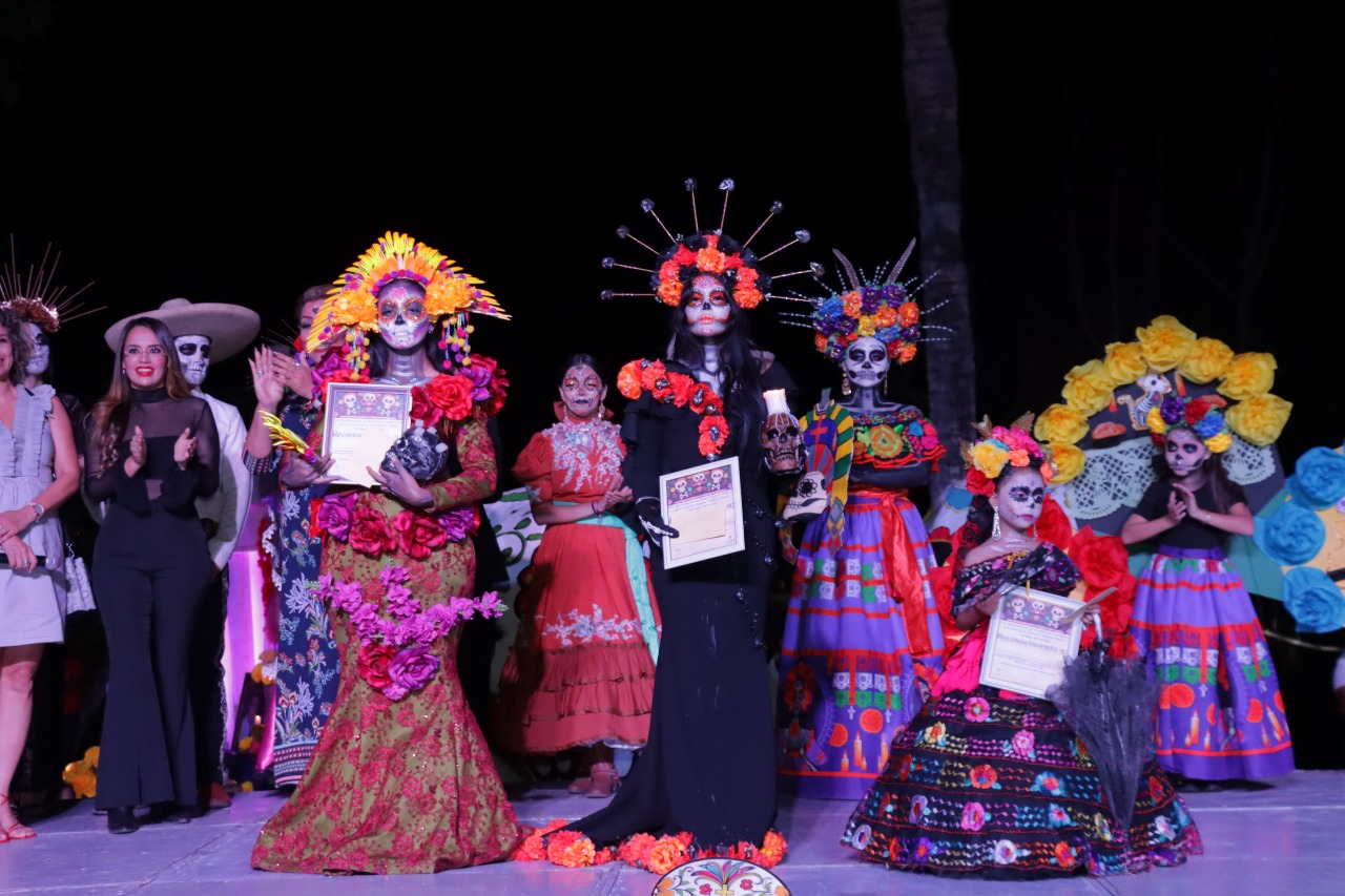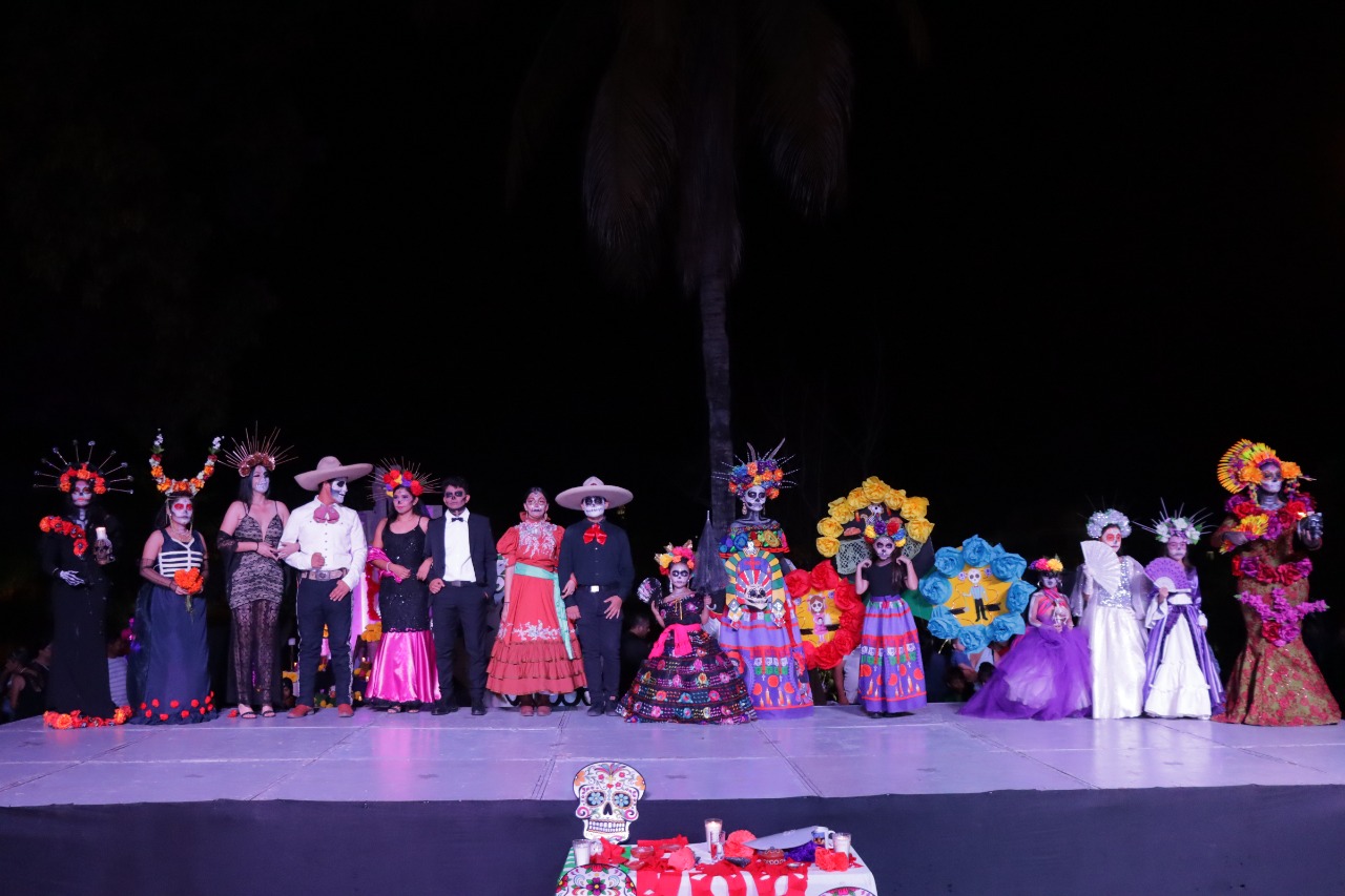 El Rosario, Sinaloa.- Como parte del Festival Tradicional de Día de Muertos en El Rosario, la emblemática Laguna del Iguanero albergó a cientos de personas quienes disfrutaron del concurso de catrinas y catrines que el Gobierno de Rosario que Preside Claudia Valdez Aguilar organizó sorprendiendo al término de este con un espectáculo de luces y juegos pirotécnicos.