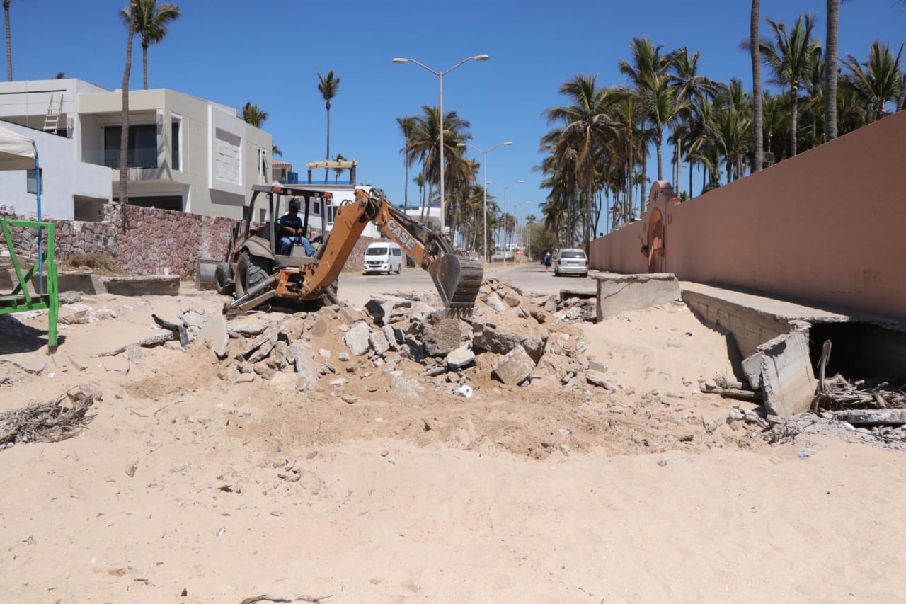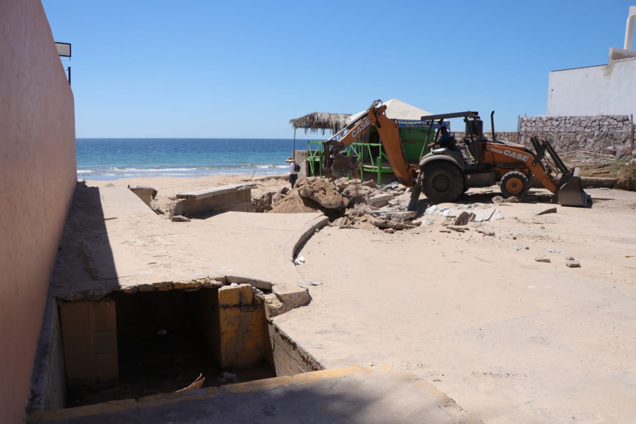 Se inició en playa cerritos, en los accesos del cárcamo de Jumapam, Estero del Yugo y Torres Mazatlán, con apoyo de maquinaria y una cuadrilla se retiraron las lozas colapsadas y en mal estado.