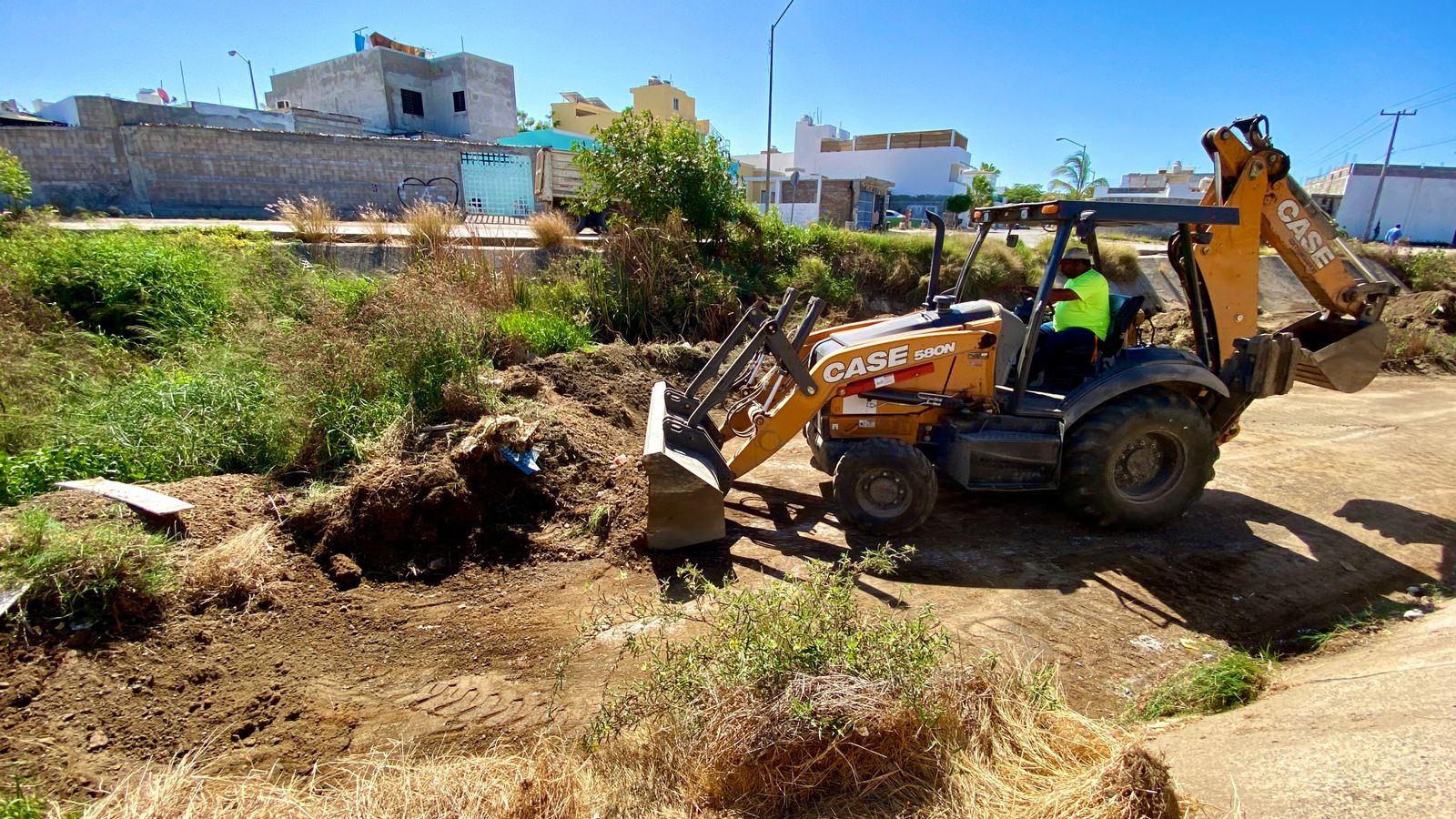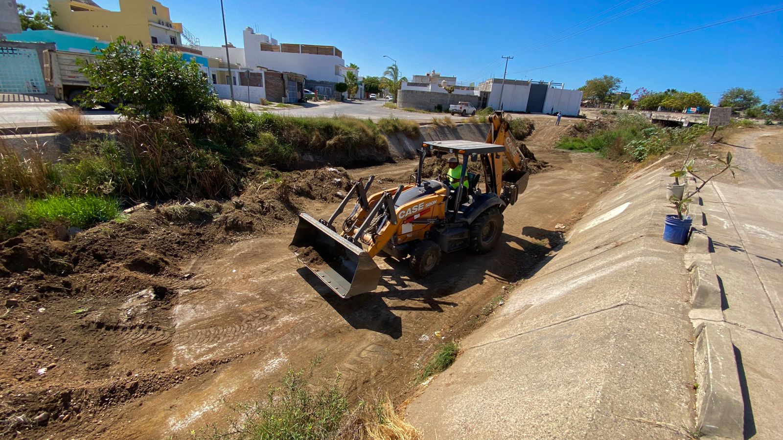 Mazatlán, Sinaloa 22 de mayo 2023-. Ante la llegada de la temporada de lluvias, la dirección de obras públicas lleva a cabo trabajos de revestimiento y limpieza de canales en la ciudad.