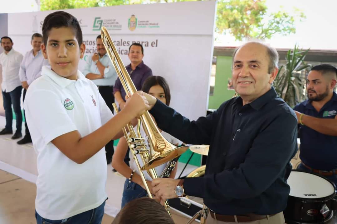“Me da mucho gusto que estudiantes de primaria, secundaria y preparatoria después de salir de sus clases vengan a aprender música, es darle continuidad a esa herencia cultural que tienen aquí en la región, sé que muchos son hijos de músicos, sobrinos o nietos, y no tengo la menor duda que aquí en este Centro de Iniciación Musical van a aprender a tocar diversos instrumentos”.Al hablar en nombre de los beneficiarios, el alumno Jorge Muñoz, mencionó que gracias al apoyo del Gobierno de Sinaloa ahora su comunidad cuenta con una escuela de música, además de que ahora él como sus compañeros tendrán instrumentos musicales, ya que en algunos casos no cuentan con los recursos necesarios para adquirirlos.