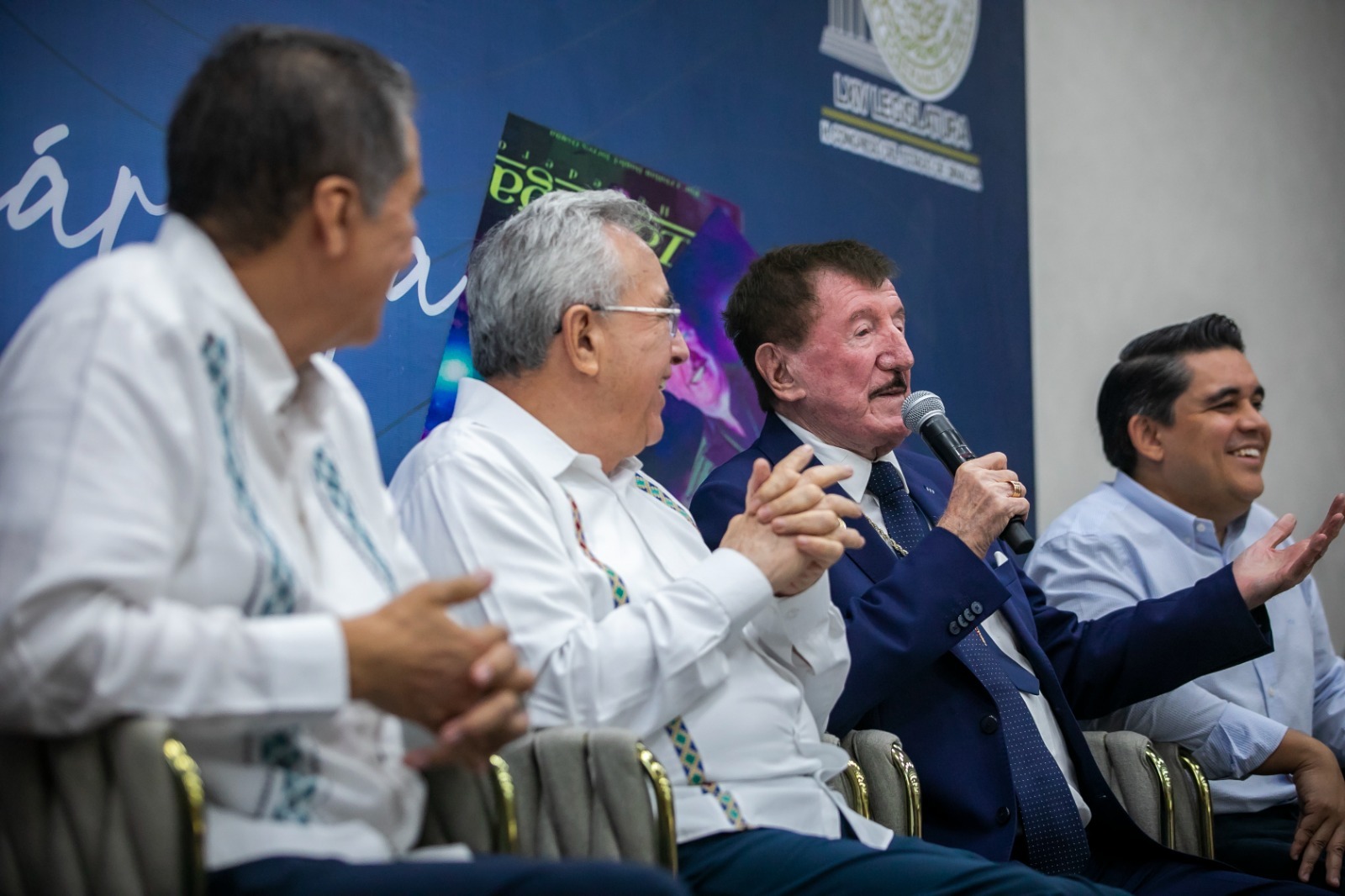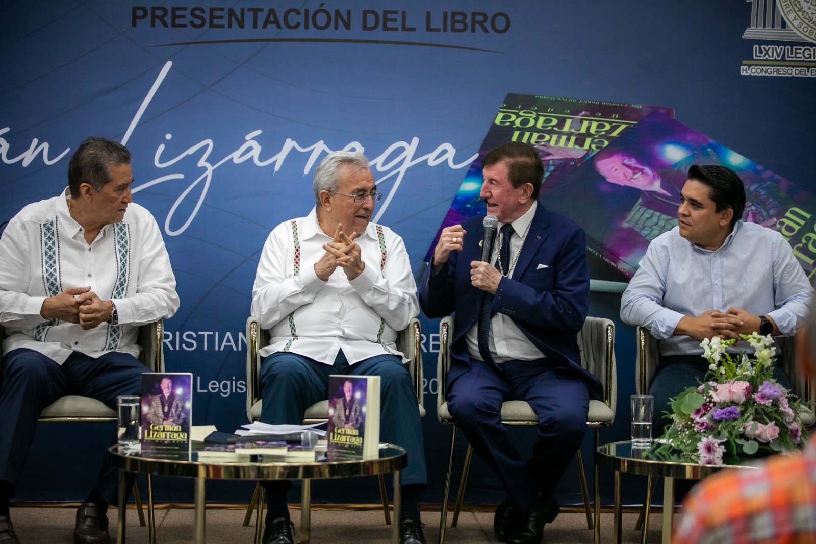 Culiacán, Sinaloa, a 28 de Junio de 2023.- Al ritmo de las espectaculares notas musicales de la banda “Estrellas de Sinaloa” que inundaron de alegría el Salón Constituyentes de Congreso del Estado, este miércoles el Gobernador Rubén Rocha Moya participó como comentarista en la presentación del libro “Germán Lizárraga, el Heredero” organizado por la LXIV Legislatura, cuyos diputados Feliciano Castro Meléndrez, Presidente de la Junta de Coordinación Política y Ricardo Madrid Pérez, Presidente de la Mesa Directiva, otorgaron una cálida bienvenida al también llamado “Rey de la Banda”.