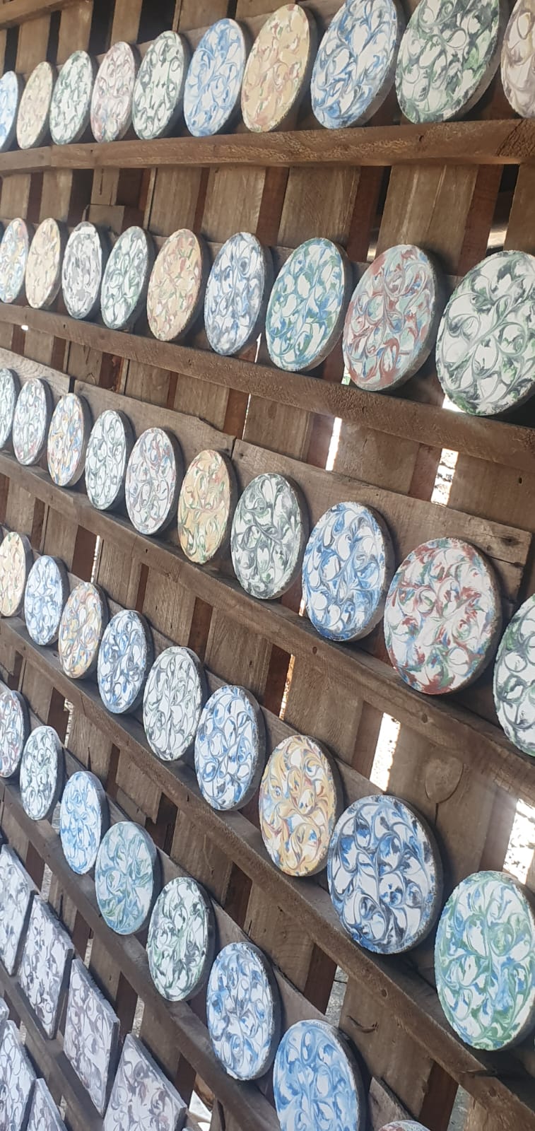 En el patio de la casa donde vive tiene adosado el taller artesanal y ahí muestra su trabajo como en una exposición; además explica cómo se hacen éstos cuadros que requieren un trabajo cien por ciento artesanal, que se hacen uno por uno y que los diseños son al gusto de los clientes.