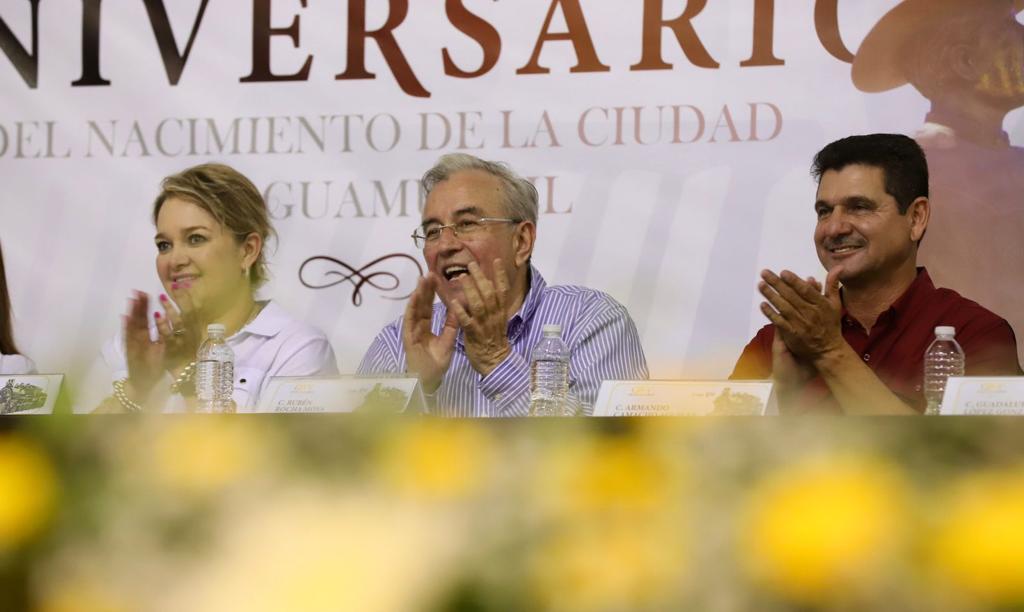 El gobernador felicitó a los homenajeados y mencionó que él es de Guamúchil, ya que tiene un gran amor por la ciudad al haber vivido tanto tiempo en el lugar.