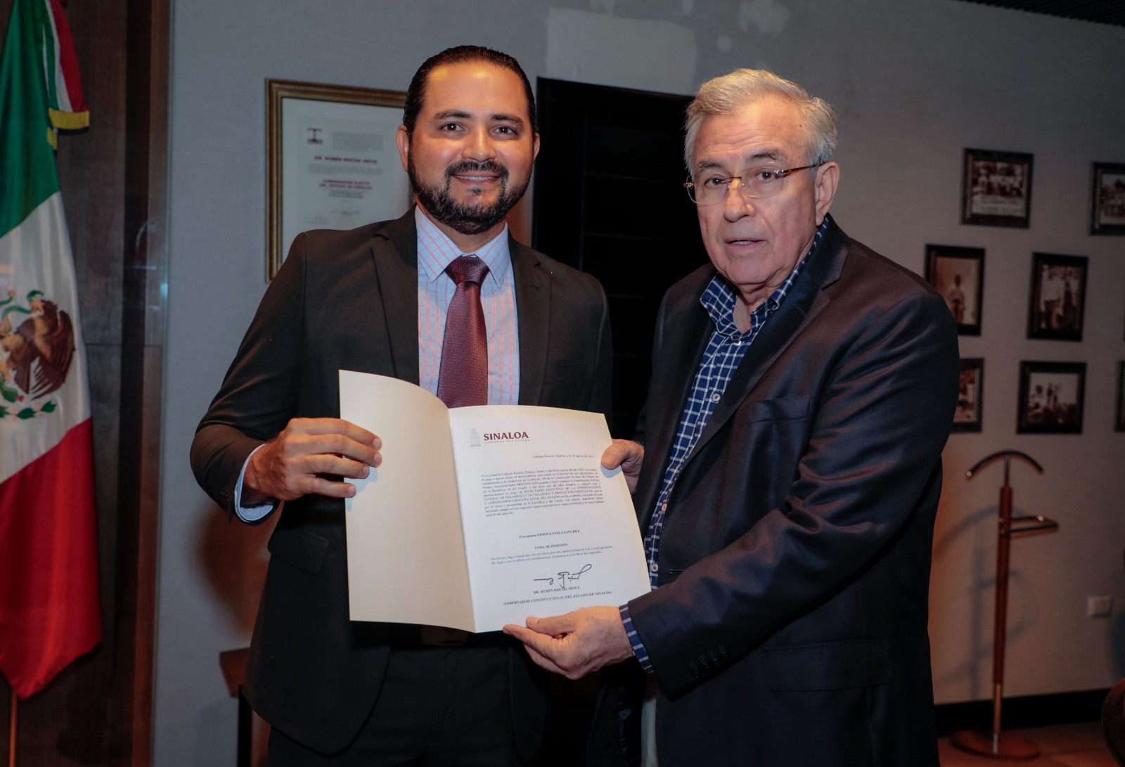 Culiacán, Sinaloa, a 28 de agosto de 2023.- El gobernador Rubén Rocha Moya nombró como secretario ejecutivo de la Coordinación General de Desarrollo Tecnológico y Proyectos Especiales a Edwin Favela Sánchez, quien sustituye en el cargo al ahora secretario de Obras Públicas, Joaquín Alberto Landeros Güicho.