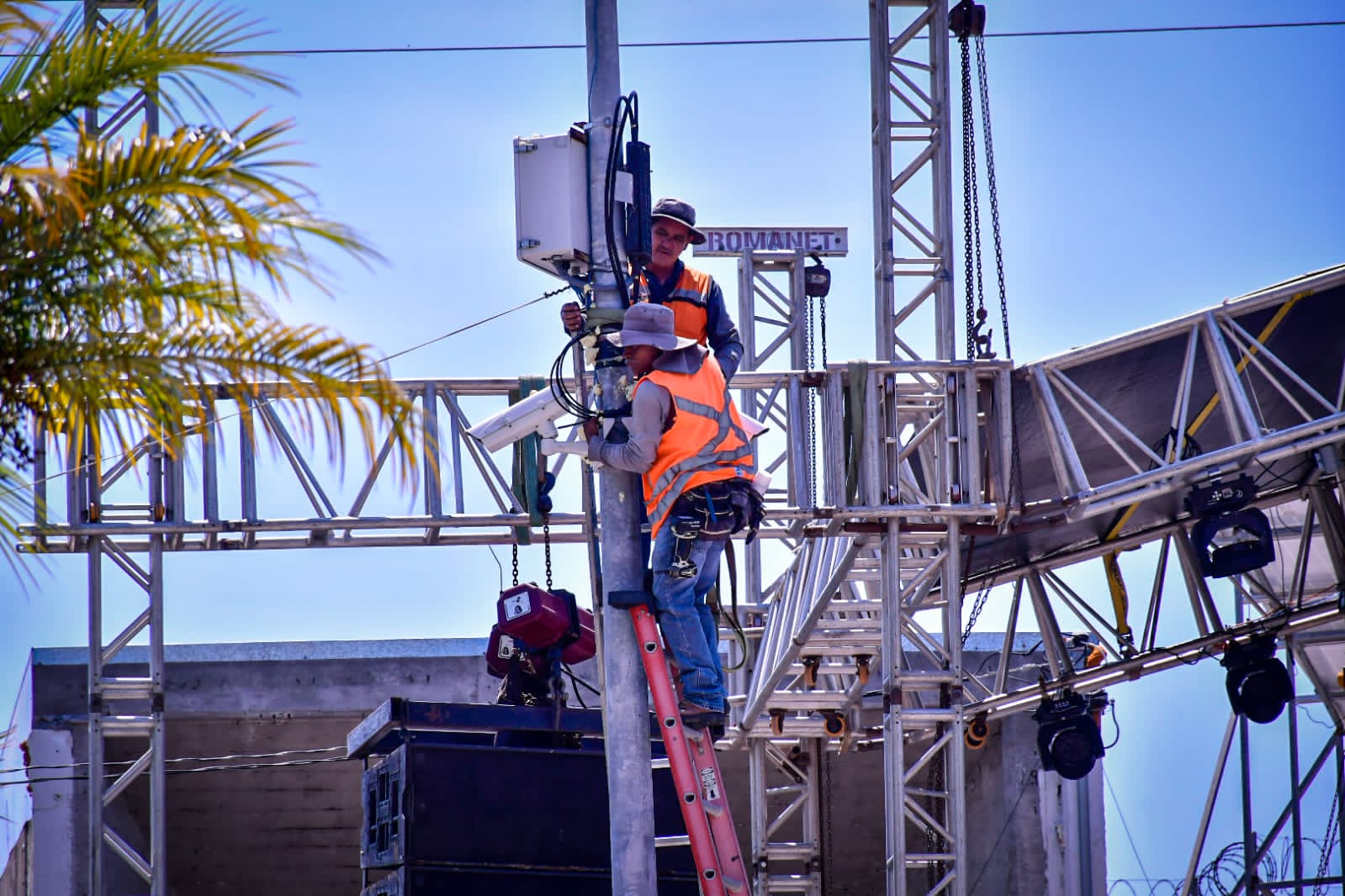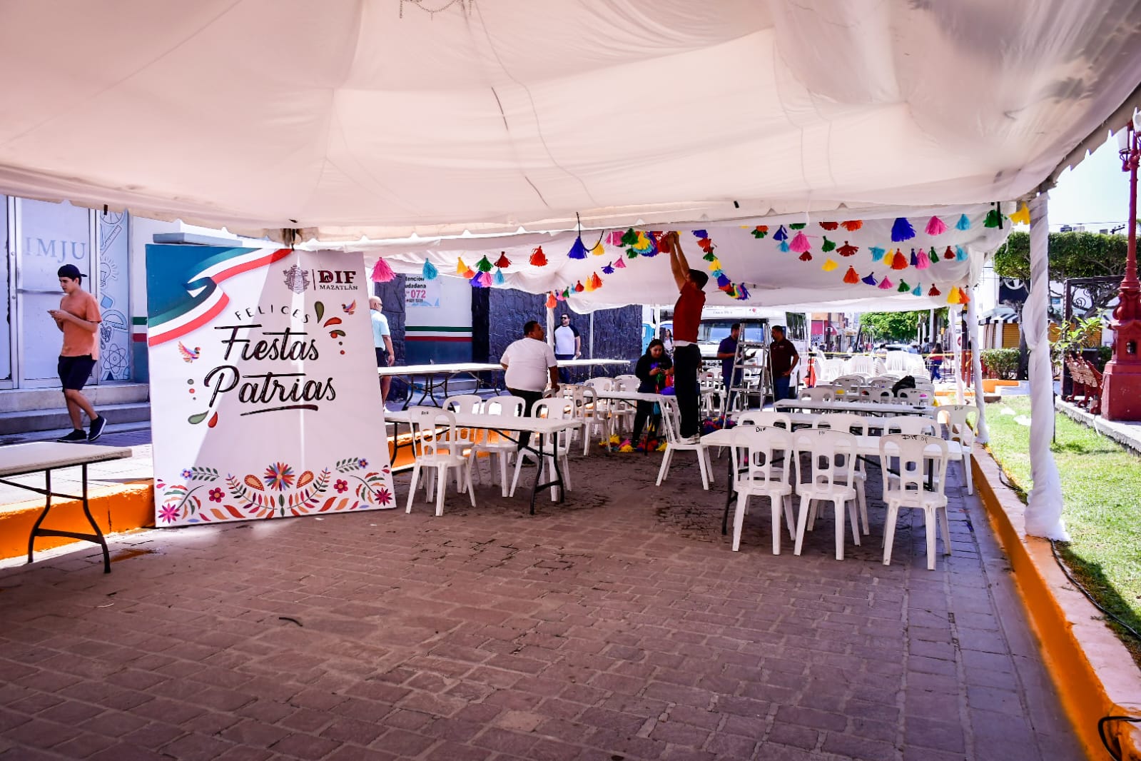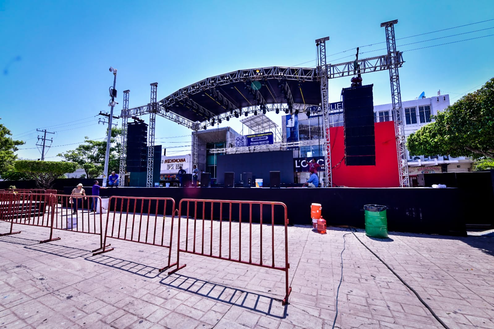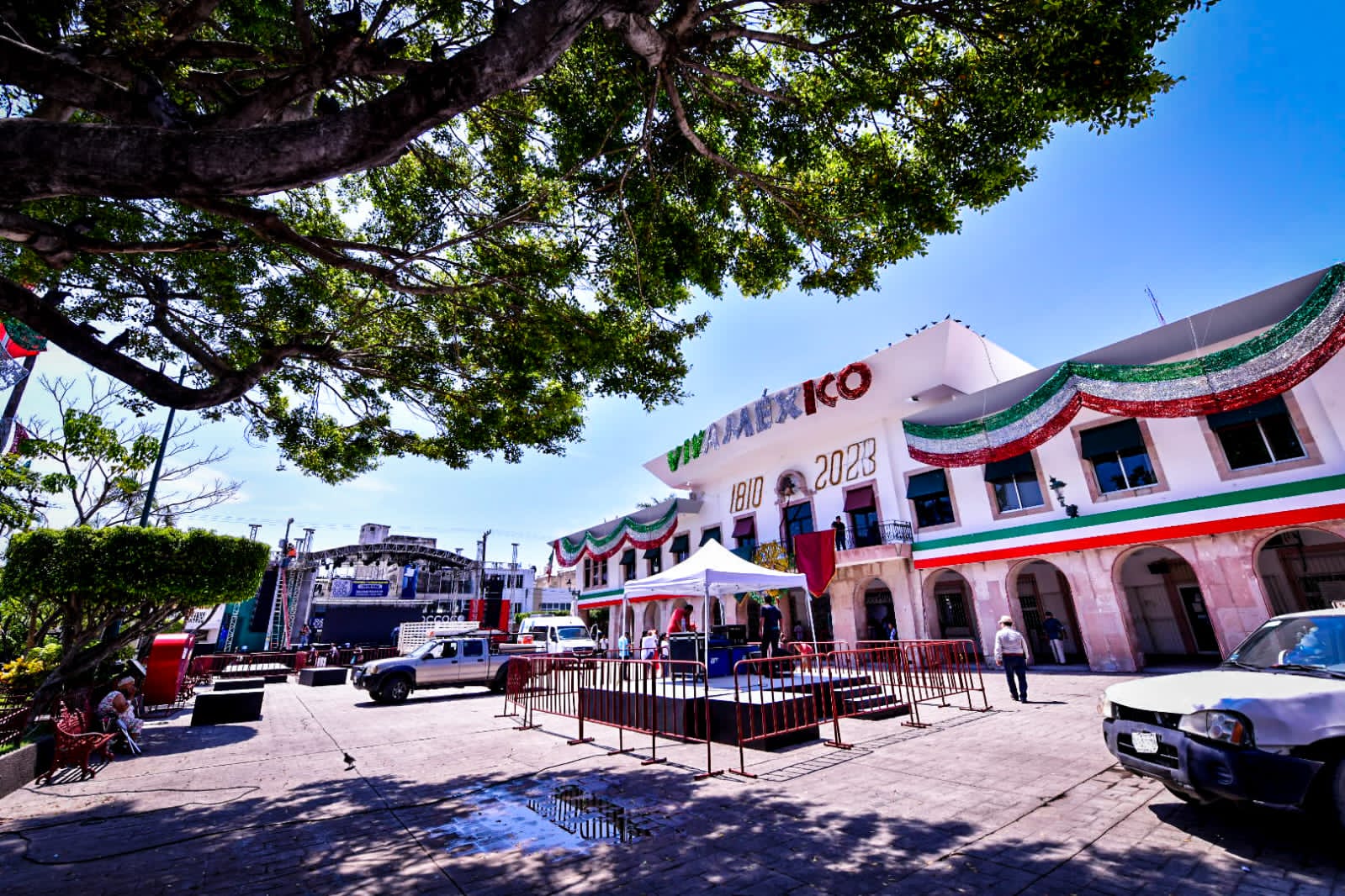 Mazatlán, Sinaloa, 15 de septiembre de 2023.- A paso acelerado trabaja personal de diversas áreas del Gobierno Municipal en los preparativos finales de la verbena popular y el evento artístico que enmarcarán la ceremonia del Grito de Independencia.