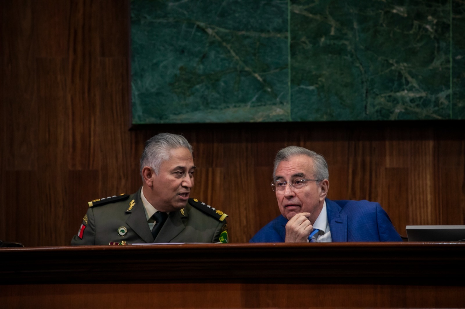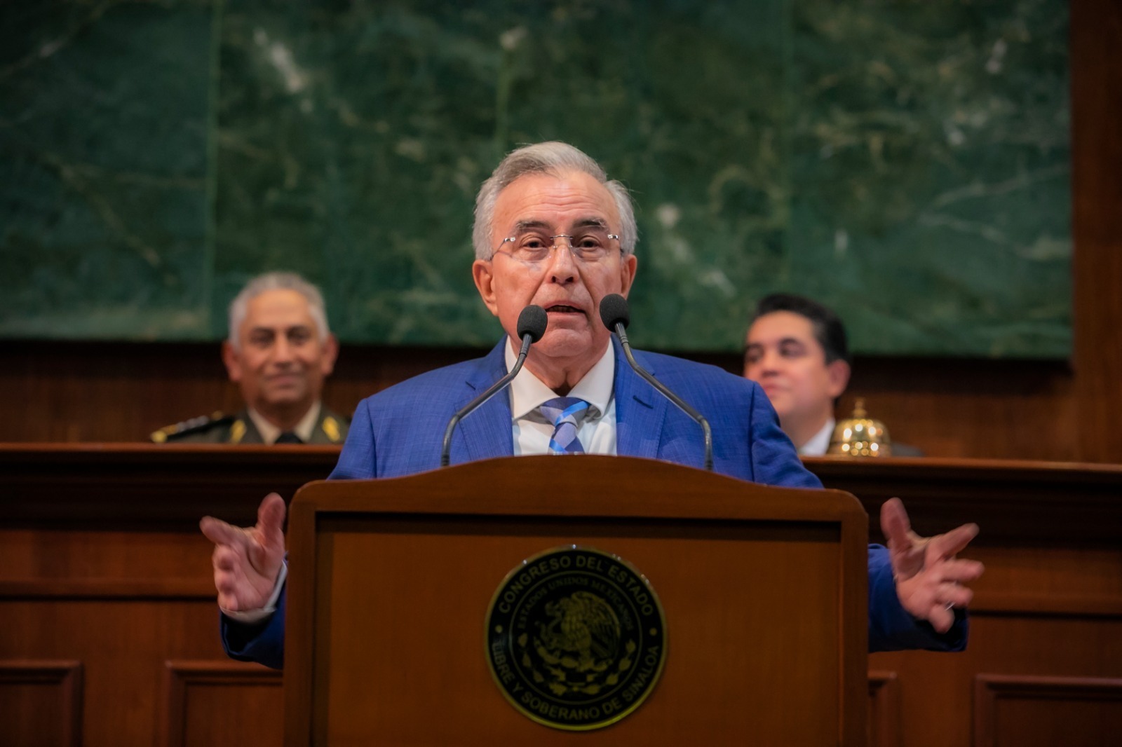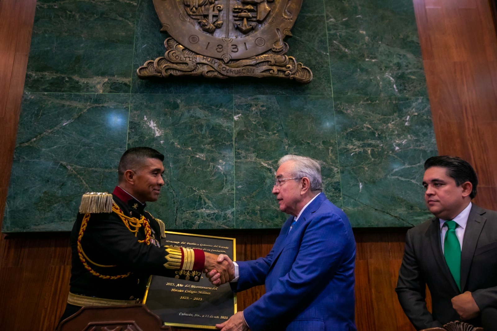 Culiacán, Sinaloa, a 25 de Septiembre de 2023.- Como un merecido y justo reconocimiento a la institución más respetada y apreciada por los mexicanos por su aportación con cuadros calificados técnica, teórica y cívicamente a las fuerzas armadas de la nación, calificó el Gobernador Rubén Rocha Moya la develación de la Inscripción en Letras Doradas de la Leyenda “2023, Año del Bicentenario del Heroico Colegio Militar”, al acudir este lunes a la Sesión Solemne del H. Congreso del Estado de Sinaloa con este motivo, acto al que también asistieron como invitados de honor el General de División D. E. M. Francisco Jesús Leana Ojeda, Comandante de la Tercera Región Militar y Jesús Iván Chávez Rangel, Presidente del Supremo Tribunal de Justicia del Estado.