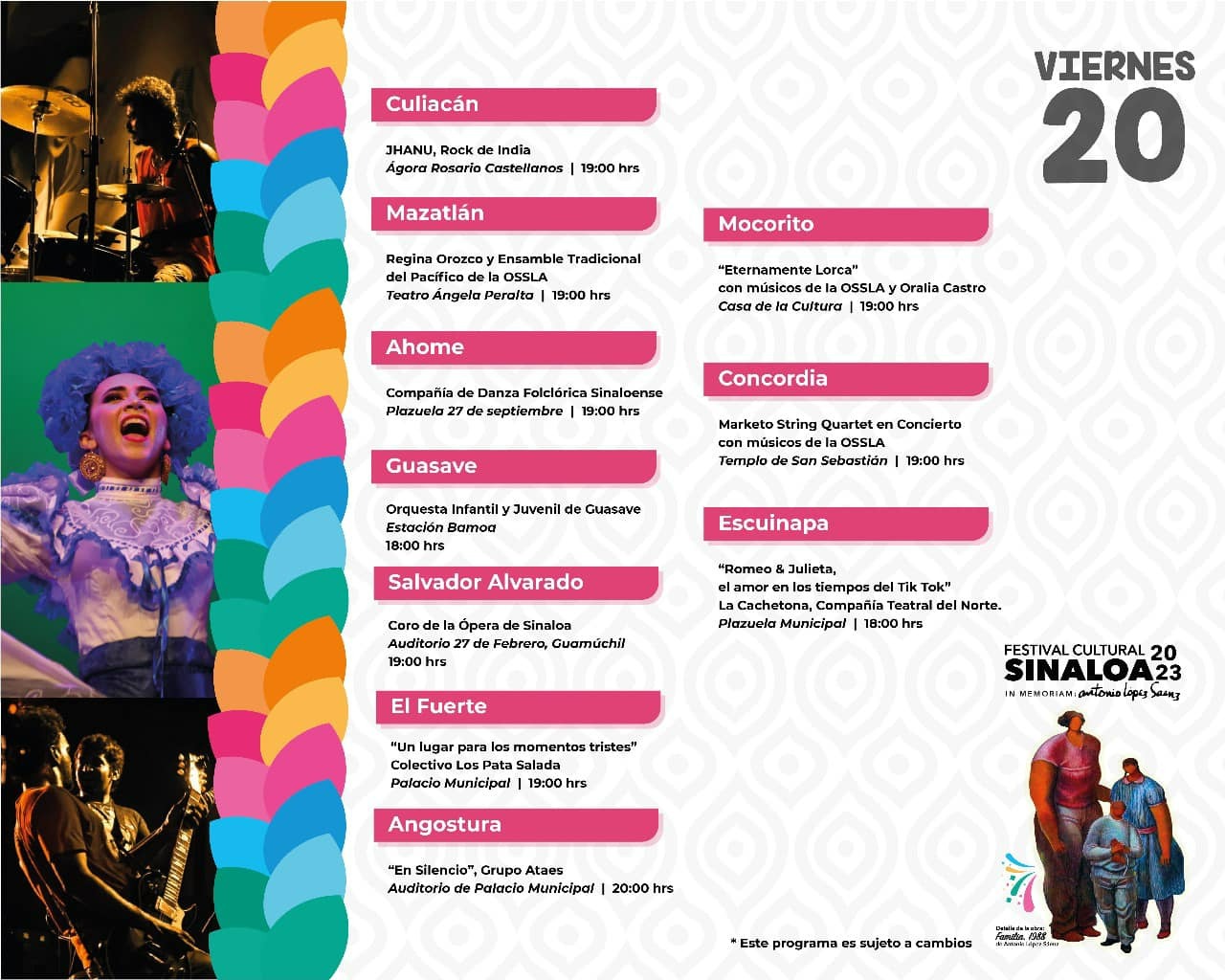 En Los Mochis, el viernes 20 abre con la Compañía Folclórica Sinaloense, Taco de Ojo Teatro de Cutberto López, Sabaiba Teatro, y la Orquesta Sinfónica Infantil y Juvenil de Los Mochis, entre otros.