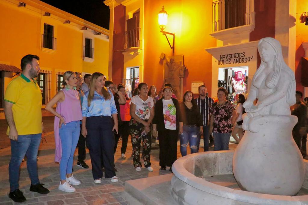 Mazatlán, Sin., octubre 16 de 2023.- Como parte de los trabajos del programa de Magia y Cultura, la Secretaria de Turismo del Estado, Estrella Palacios Domínguez, inauguró este fin de semana el callejón Arteaga y la fuente Toptli (erigida en honor a una doncella Acaxees, a quien en una temporada de extrema sequía, el Dios Neyuncame, a través de un ritual la convierte en jícara de barro para así extraer agua del subsuelo y de esa manera saciar la sed de los miembros de la tribu) ambos atractivos se suman a los murales y callejones que se han estado realizando desde el pasado mes de mayo en Cosalá.