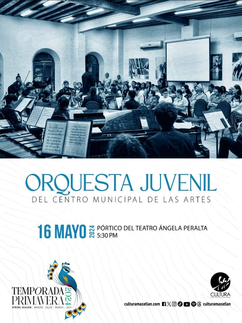 Mazatlán, Sinaloa, 14 de mayo de 2024.- Este jueves 16 de mayo en punto de las 17:30 hrs. la Orquesta Juvenil del Centro Municipal de Artes dirigida por el Mtro. Juan Carlos Chavarría ofrecerá un concierto gratuito en el pórtico del Teatro Ángela Peralta.