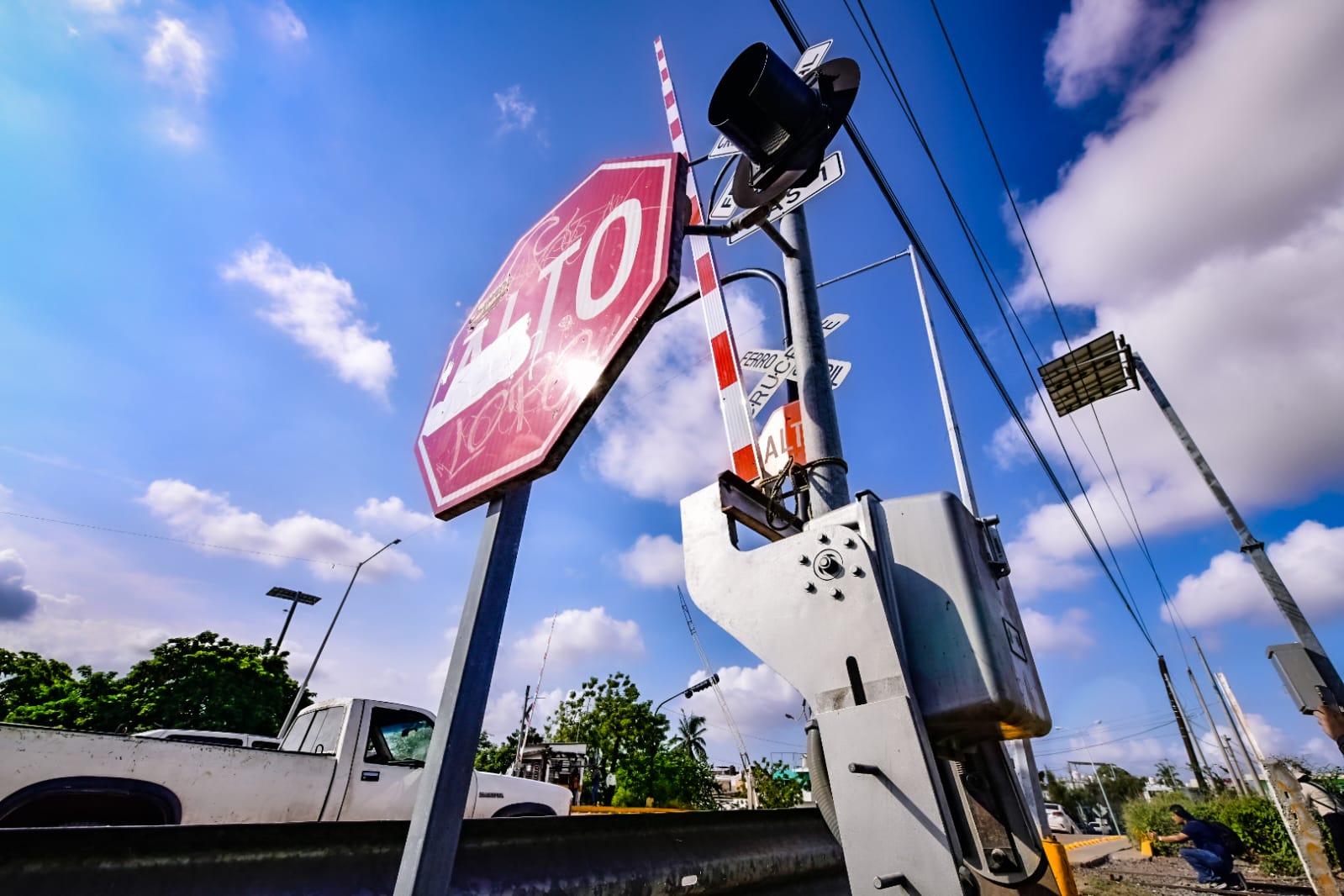Mazatlán, Sinaloa 28 agosto 2024-. La instalación de plumas en el cruce ferroviario de la Avenida Santa Rosa fue supervisada por el Alcalde Edgar González.