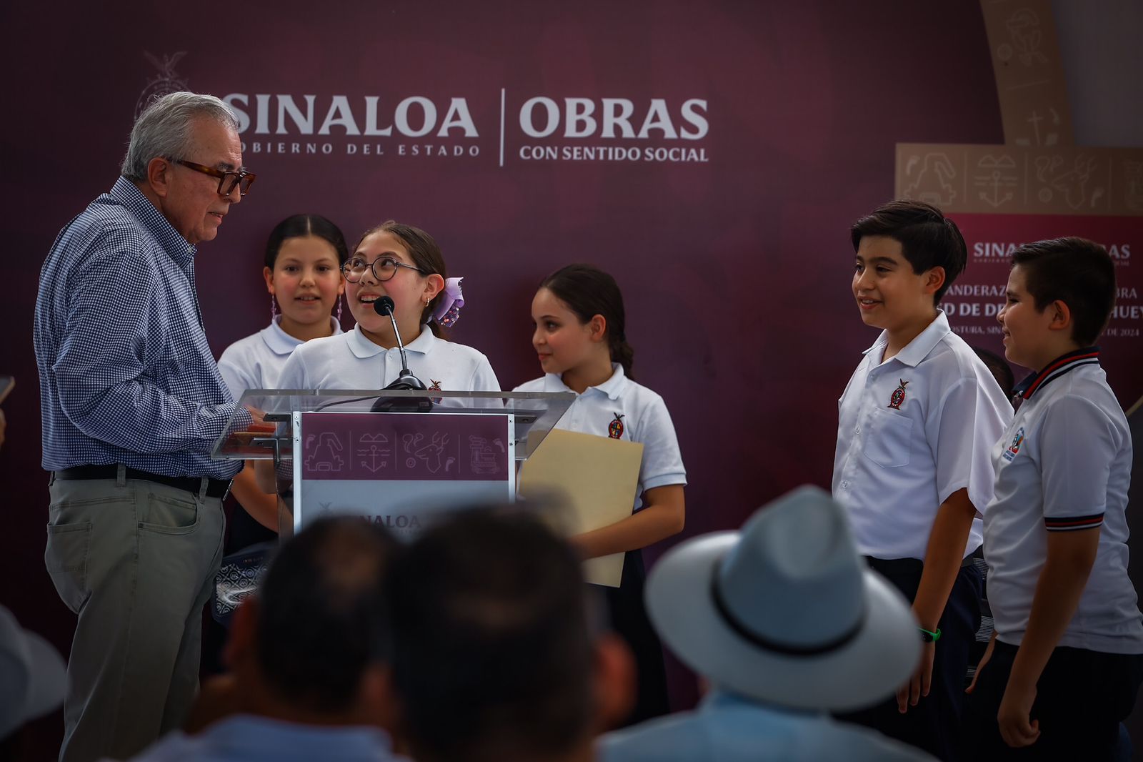 El mandatario estatal arribó a esta pequeña población acompañado por el presidente municipal, Miguel Ángel Angulo Acosta, y por su secretario de Obras Públicas, Raúl Francisco Montero Zamudio, para dar el banderazo simbólico de inicio de los trabajos, pero como es su costumbre, antes de hacerlo mantuvo un diálogo con los habitantes para conocer de primera mano sus necesidades, y por ello se comprometió a impermeabilizar a partir de mañana mismo la escuela primaria Agustina Ramírez, esto en respuesta a la petición que le hicieron varios niños estudiantes de la misma.
