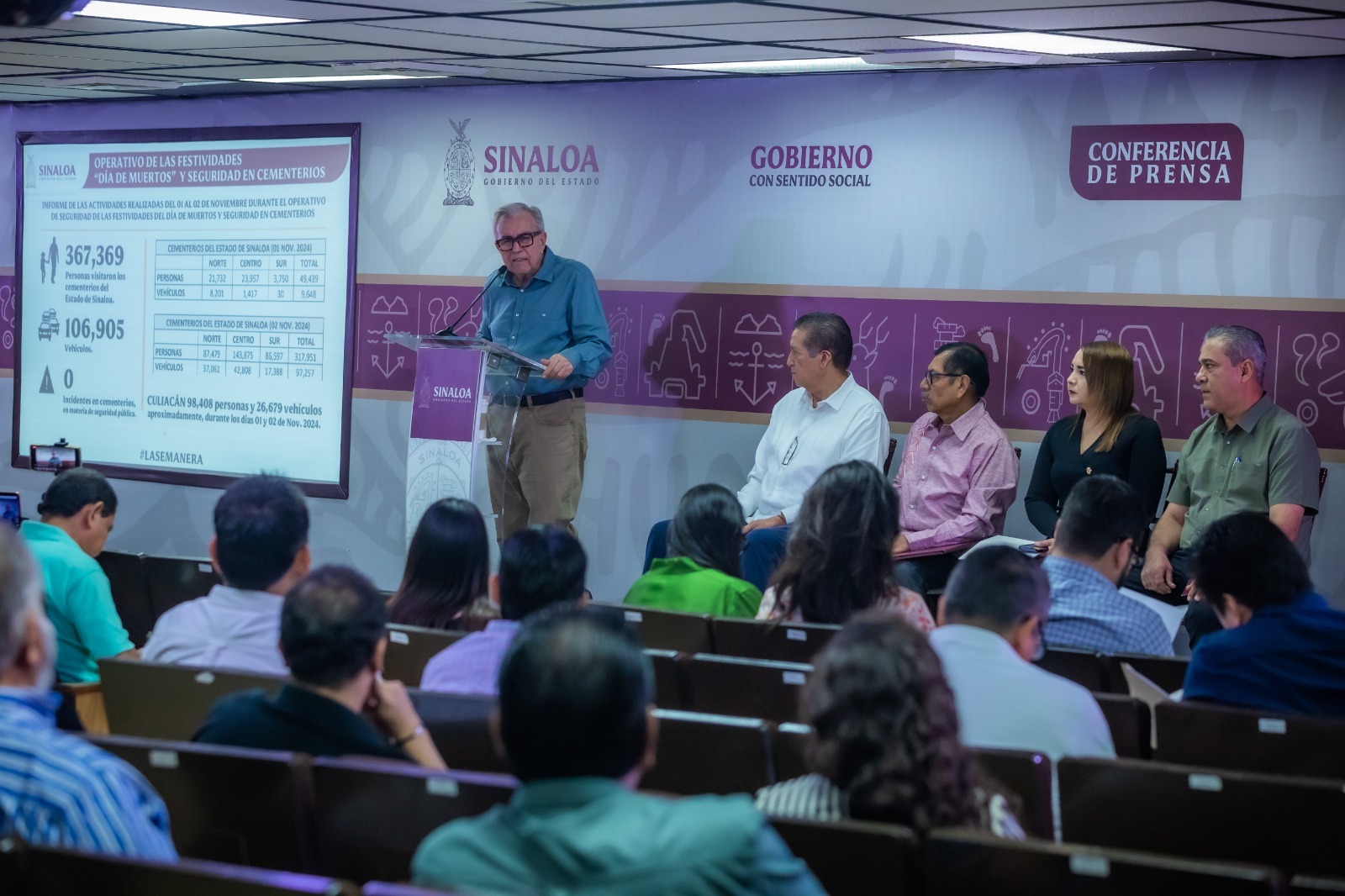 Culiacán, Sinaloa, a 04 de Noviembre de 2024.- Con una alta afluencia en los cementerios de todo el estado, se conmemoró el día de muertos en Sinaloa, señaló el Gobernador Rubén Rocha Moya durante su Conferencia Semanera, en la que precisó que se registraron más de 367 mil visitantes y 106 mil vehículos, sin que ocurriera incidente alguno.
