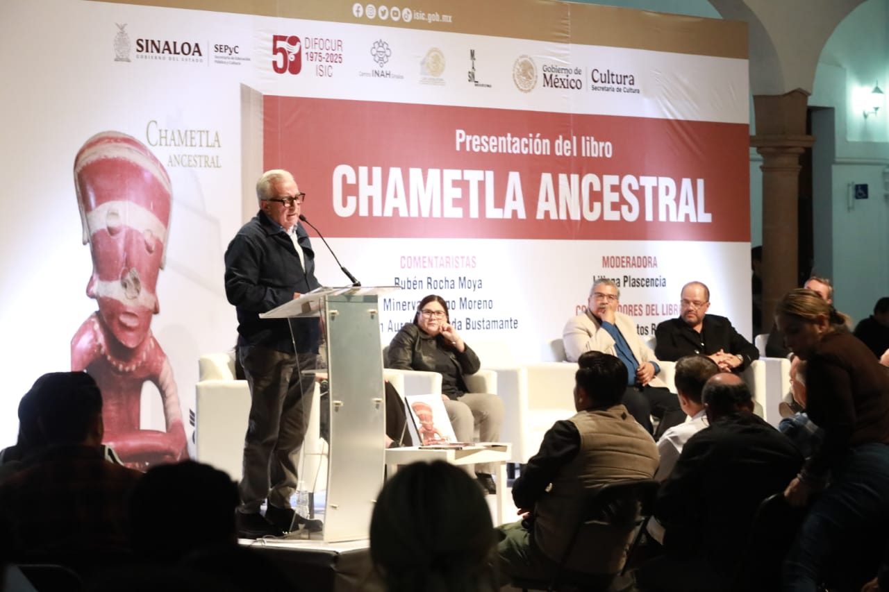 El mandatario estatal destacó la originalidad de la obra pues aborda la historia, la arqueología y nuestros ancestros, su lectura no solo es un viaje al pasado también una experiencia que permite atrapar el pasado, son aportaciones para ilustrar como en el sur del estado tuvo lugar el florecimiento de una cultura que a la fecha sigue aportando indicios qué esbozan la existencia de un pueblo que ha trascendido a través del tiempo. “El libro “Chametla Ancestral” es solo un botón de muestra, que denota nuestra riqueza histórica y cultural. Es un sólido primer paso para apreciar y aprender la construcción del pueblo originario de Chametla, a la historia general y la identidad del sur de Sinaloa”, apuntó.