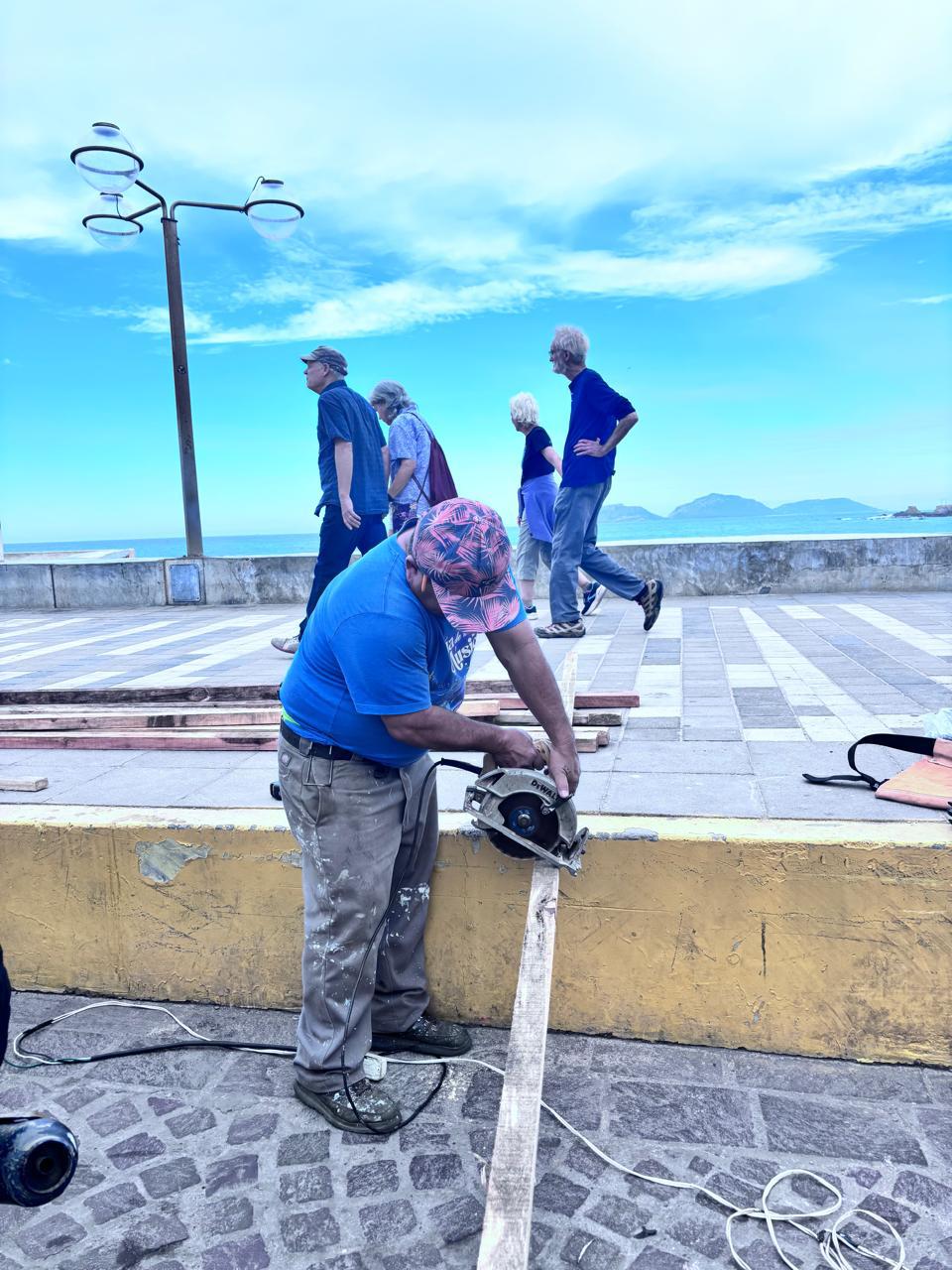 Mazatlán, Sinaloa, 14 de enero de 2025.- Iniciaron hoy los trabajos de carpintería para la ampliación de banquetas e instalación de sanitarios en la zona carnavalera de Olas Altas.