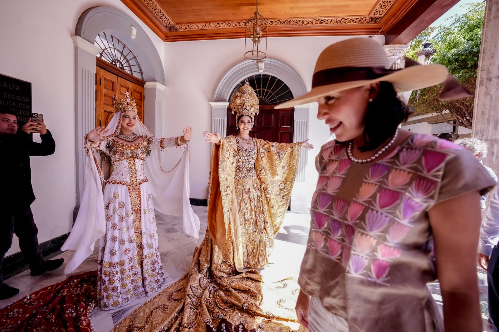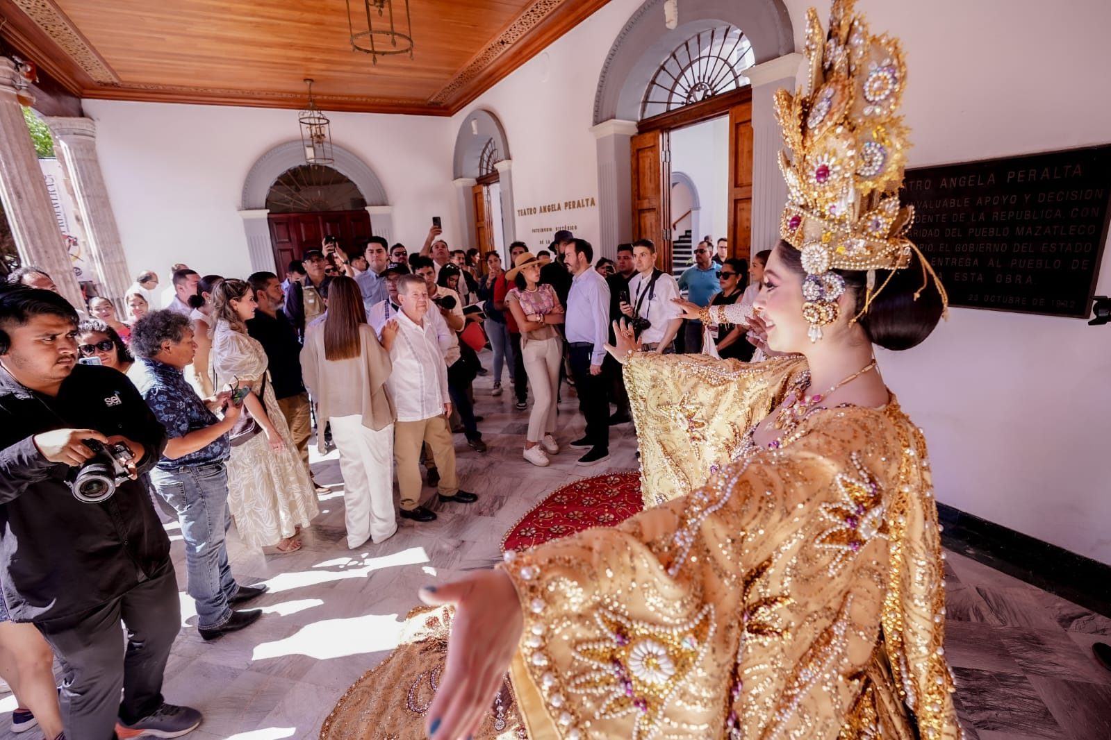 El recorrido finalizó en el Teatro Ángela Peralta, sitio que ofreció una bienvenida llena de alegría con la tradicional música de Los Papaquis, donde S. G. M. Desiré I, Reina de los Juegos Florales del Carnaval Internacional de Mazatlán 2025, y la Princesa Real Samantha Bastidas engalanaron el evento.