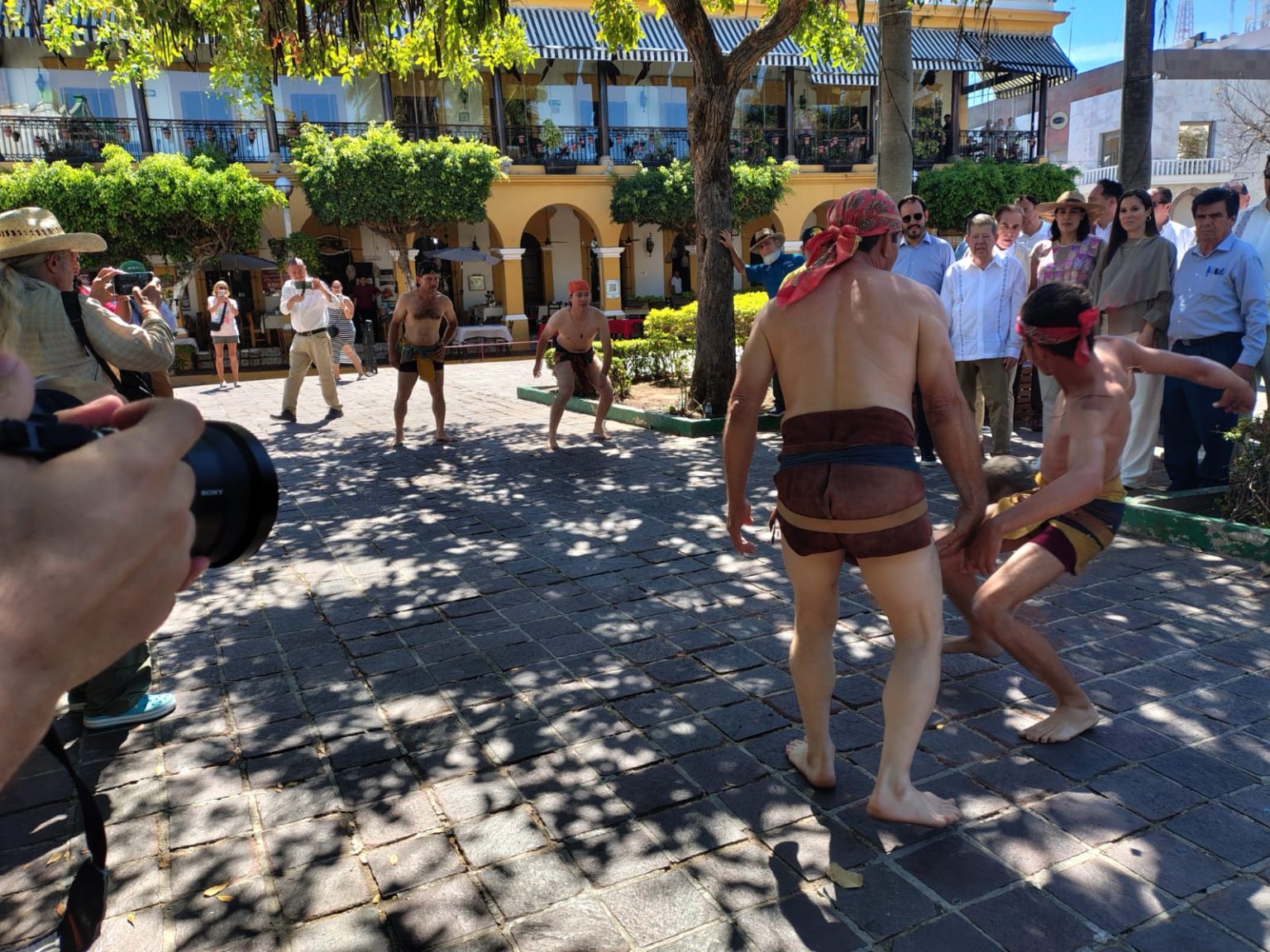 La funcionaría federal luego de reunirse con los sectores empresarial y hoteleros arribó a la Plazuela Machado en pleno Centro Histórico de Mazatlán junto con su homóloga la Secretaria de turismo Estatal Mireya Sosa quienes juntas recorrieron la Plazuela Machado y ahí fueron recibidas por muestras culturales y artísticas, como los ulameroros que jugaron un juego de Ulama.