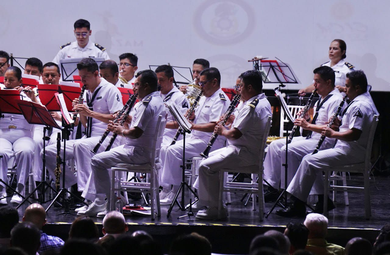 El evento, que celebró la disciplina y compromiso artístico de los músicos navales de carrera, contó con la presencia del Vicealmirante del Cuerpo General, diplomado del Estado Mayor, José Daniel Reséndiz Sandoval, comandante de la Cuarta Región Naval, y Estrella Palacios Domínguez, presidenta municipal de Mazatlán, Sinaloa, junto a otras personalidades y un entusiasta público que llenó las butacas del teatro.