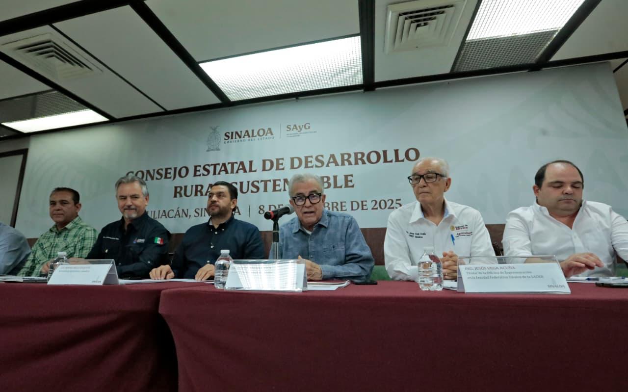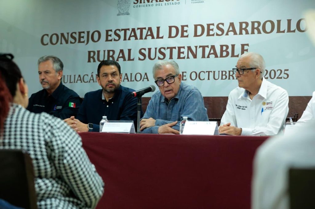 Culiacán, Sinaloa 08 de octubre de 2025.- En vísperas de iniciar el próximo ciclo agrícola otoño-invierno 2025-2026 y manteniendo el diálogo cercano y abierto entre gobierno y sector agrícola estatal, el gobernador Rubén Rocha Moya, acompañado del secretario de Agricultura y Ganadería Ismael Bello Esquivel, encabezó la reunión del Consejo Estatal de Desarrollo Rural Sustentable del estado de Sinaloa a fin de evaluar la próxima temporada agrícola y la superficie de siembras a establecer.
