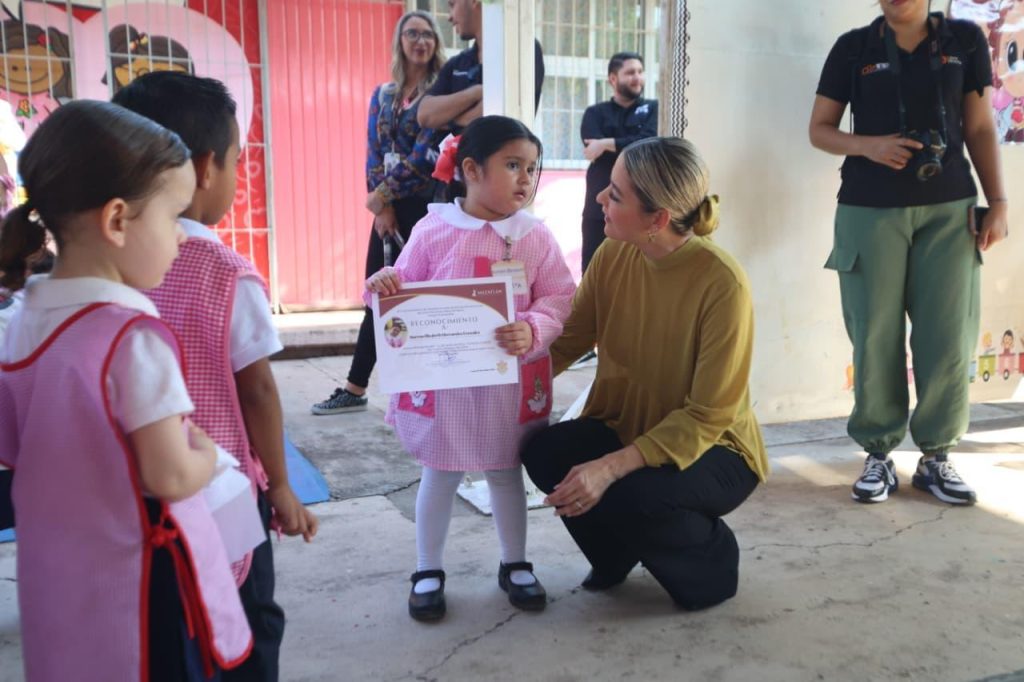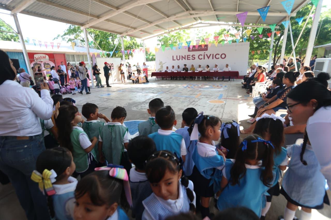 Mazatlán, Sinaloa, 20 de octubre de 2025.- El Gobierno de Mazatlán está comprometido con la educación, porque cuando se apoya a una escuela, se transforma a Mazatlán y se siembra la semilla de un mejor mañana, enfatizó la Presidenta Municipal, Estrella Palacios Domínguez, durante la ceremonia del Lunes Cívico en el Jardín de Niños Zoraida Pineda, ubicado en el Ejido El Castillo.