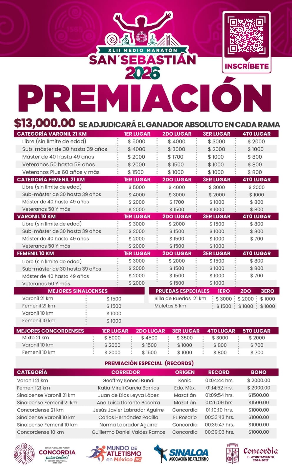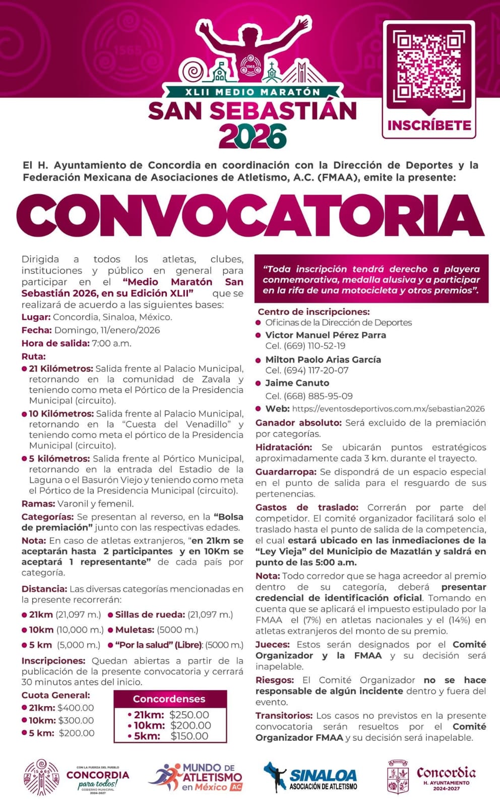 Mazatlán, Sinaloa, 15 de diciembre de 2025.- Más de 500 corredores participarán en la edición 42 del Medio Maratón San Sebastián, que se realizará el 11 de enero de 2026 en el municipio de Concordia, Sinaloa.
