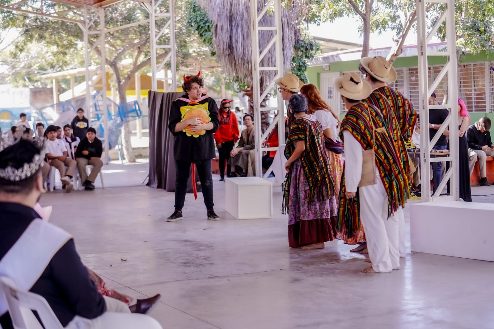 La obra “Pastorela Mexicana”, escrita por el talentoso actor Sergio Esquivel, transformó la tarde en un festín de humor y alegría. Con un elenco compuesto por alumnos de la carrera técnica en Arte Teatral y algunos egresados, la historia, que gira en torno a elementos tradicionales del nacimiento de Jesucristo, fue presentada de una manera fresca y divertida, capturando la atención y risas de los jóvenes espectadores.