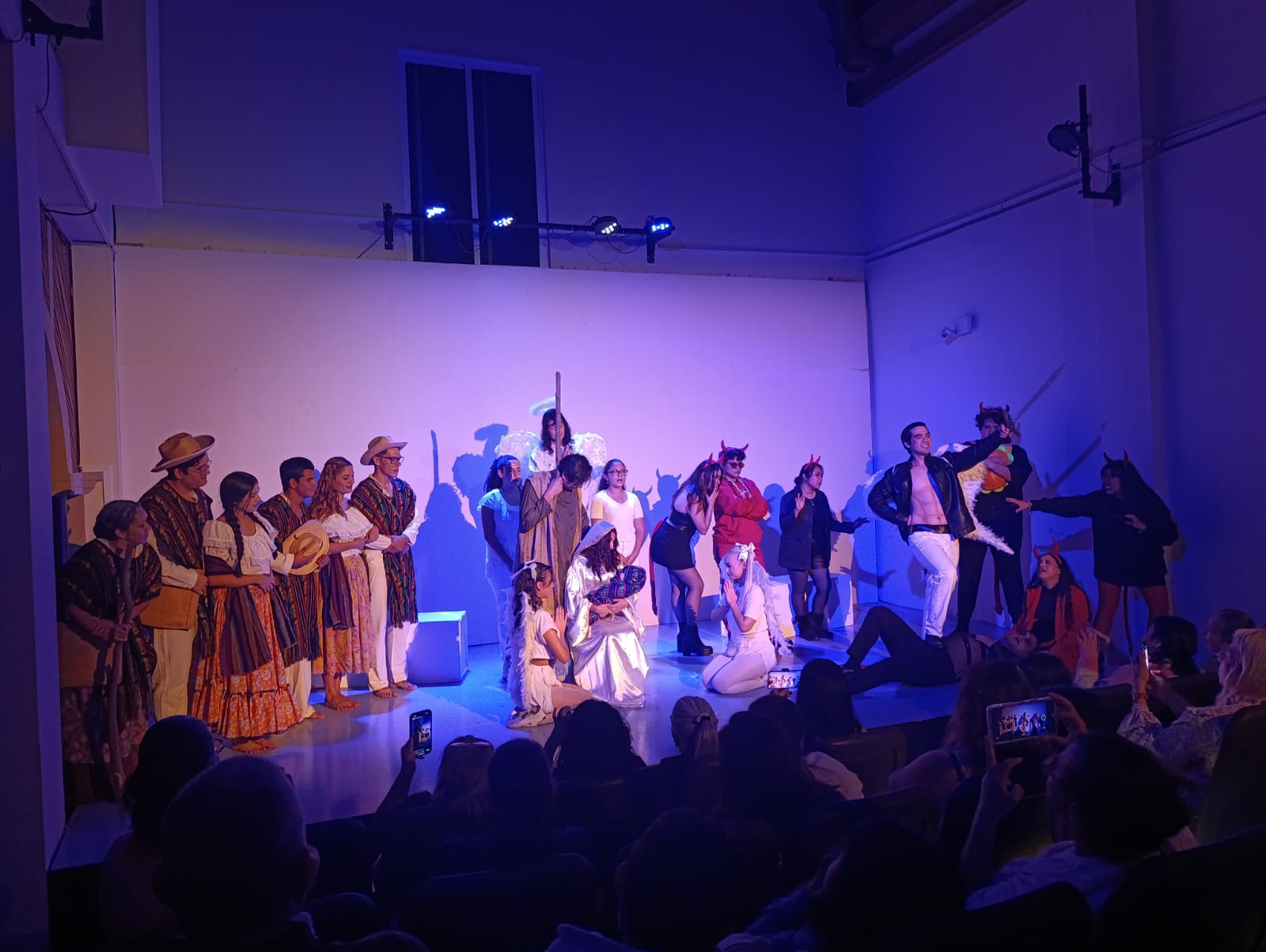 Bajo la dirección de la maestra Silvia Flores, un elenco de 21 artistas divirtió al público. Con una interpretación cautivadora y diálogos ingeniosos, la obra mantuvo a los espectadores riendo de principio a fin. Esta alegoría sobre el Nacimiento de Cristo se enriqueció con escenas chuscas y personajes extravagantemente memorables, llevando a la audiencia a presenciar la eterna lucha entre las fuerzas del bien y el mal que envuelve el camino de un grupo de pastores hacia el Niño Dios.