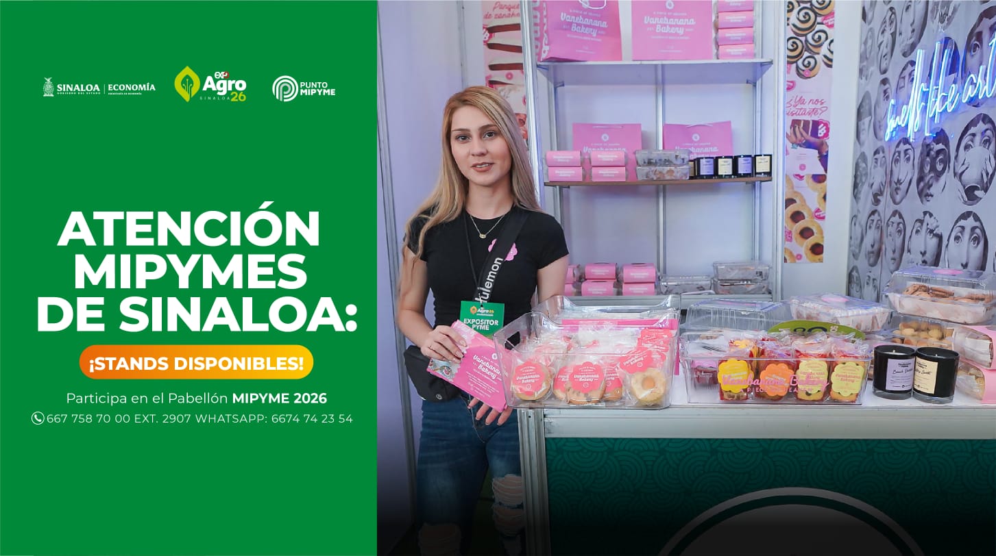 Con el objetivo de fortalecer a las micro, pequeñas y medianas empresas sinaloenses, la Secretaría de Economía del Gobierno del Estado invita a las MiPyMEs a participar en el Pabellón PyME y el Centro de Negocios que se instalarán en el marco de Expo Agro 2026, a realizarse los días 25 y 26 de febrero en la ciudad de Culiacán, en la sindicatura de Aguaruto.