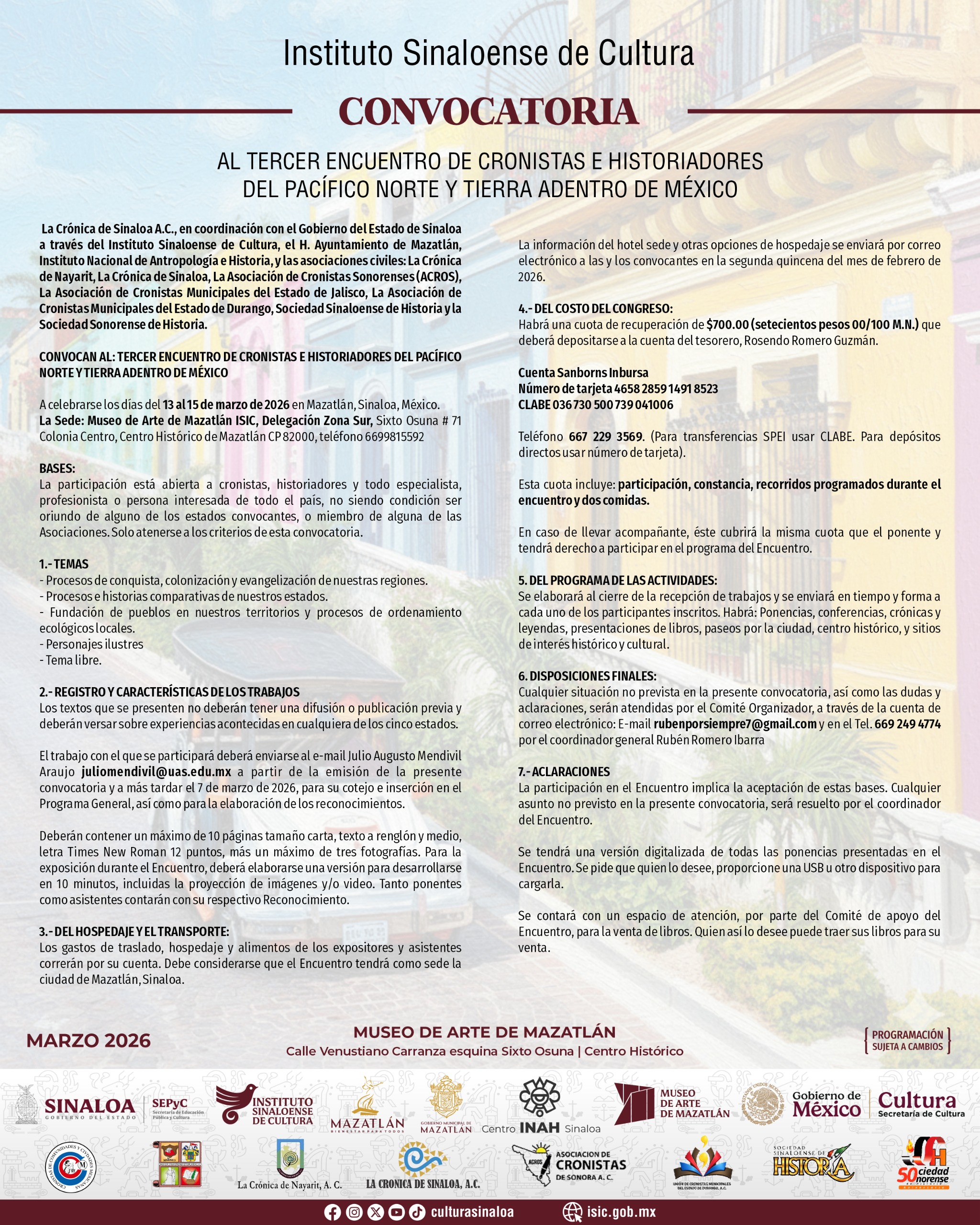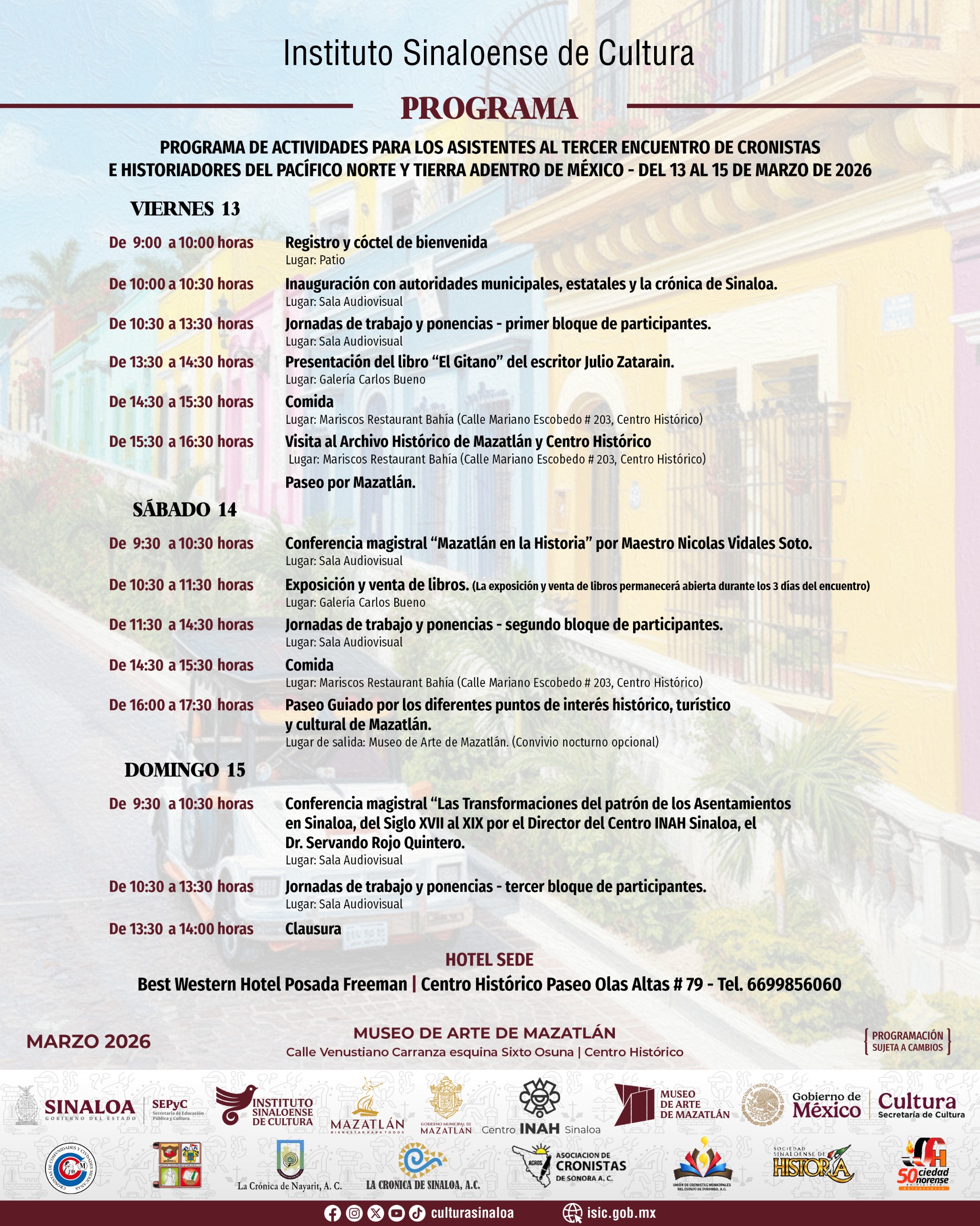 Mazatlán, Sin.– El Instituto Sinaloense de Cultura (ISIC), a través de su Delegación Sur, invita a cronistas, historiadores, investigadores y público interesado a participar en el 3° Encuentro de Cronistas e Historiadores del Pacífico Norte y Tierra Adentro, que se llevará a cabo los días 13, 14 y 15 de marzo de 2026, en el Museo de Arte de Mazatlán.