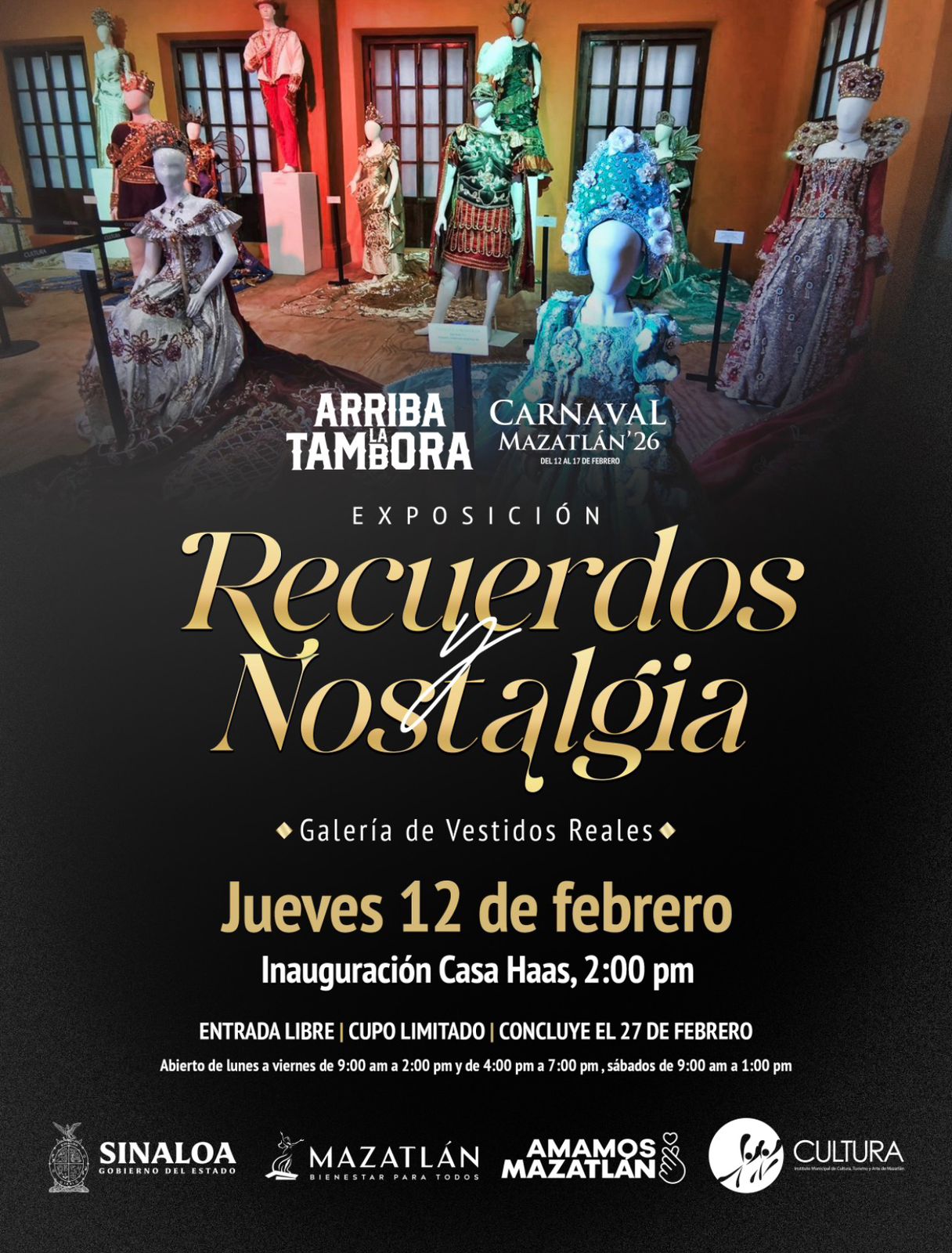 Mazatlán, Sinaloa, 05 de febrero de 2026.– En el marco de los 128 años de tradición de nuestra máxima fiesta, el Instituto Municipal de Cultura, Turismo y Arte de Mazatlán invita al público a la inauguración de la exposición de vestuario real “Recuerdos y Nostalgia”. La cita es el jueves 12 de febrero a las 14:00 horas en Casa Haas. Acceso gratuito. La exposición permanecerá abierta al público hasta el 27 de febrero.