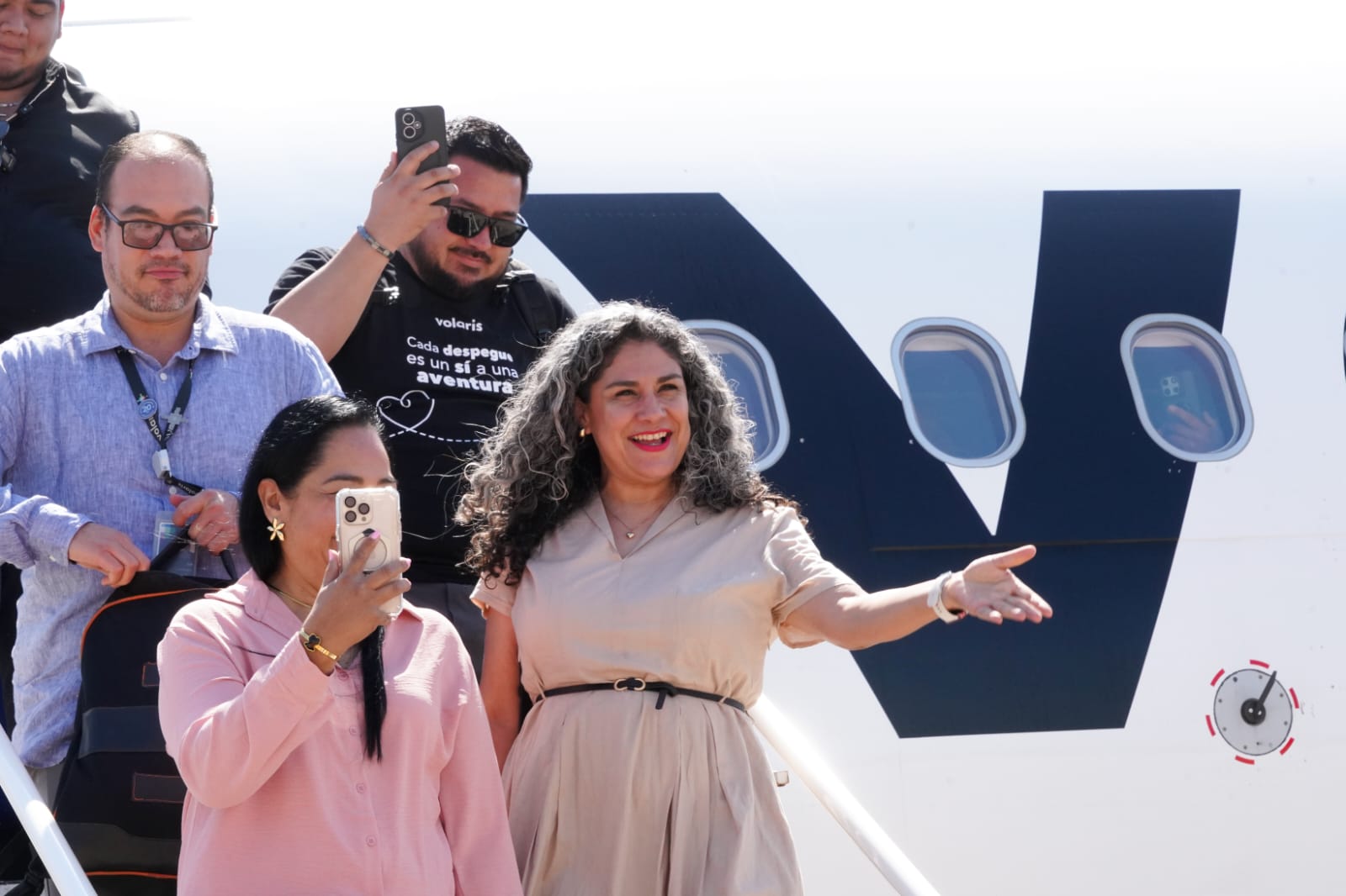 La secretaria de Turismo de Sinaloa, Mireya Sosa Osuna, le dio la bienvenida a los pasajeros junto a autoridades municipales, de la aerolínea y del grupo aeroportuario OMA.
