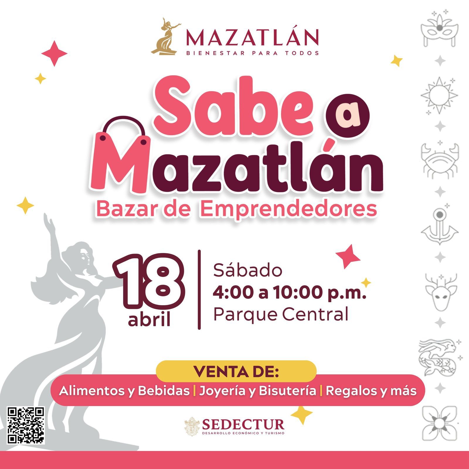 Mazatlán, Sinaloa, 17 de abril de 2026.– El Gobierno Municipal, encabezado por la Presidenta Estrella Palacios Domínguez, a través de la Secretaría de Desarrollo Económico y Turismo (SEDECTUR), anunció la realización de una nueva edición del Bazar de Emprededores “Sabe a Mazatlán”, un espacio diseñado para que visitantes y locales disfruten de la riqueza gastronómica, así como de artesanías y diversos productos tradicionales del puerto.
