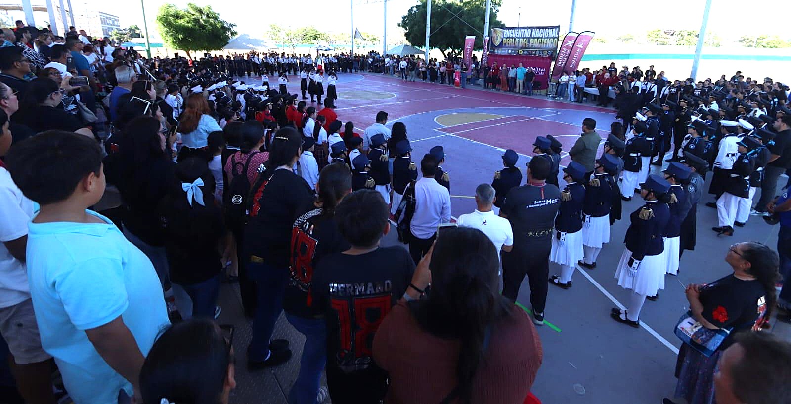 Mazatlán, Zona Trópico, Sinaloa, México, a; 24 de abril de 2026.- Con la participación de más de 95 conjuntos de 18 estados de la República mexicana, la Presidenta Municipal, Estrella Palacios Domínguez, encabezó este viernes la inauguración del 14° Encuentro Nacional de Bandas de Guerra y Escoltas “Perla del Pacífico”, realizado en la Unidad Deportiva Benito Juárez.