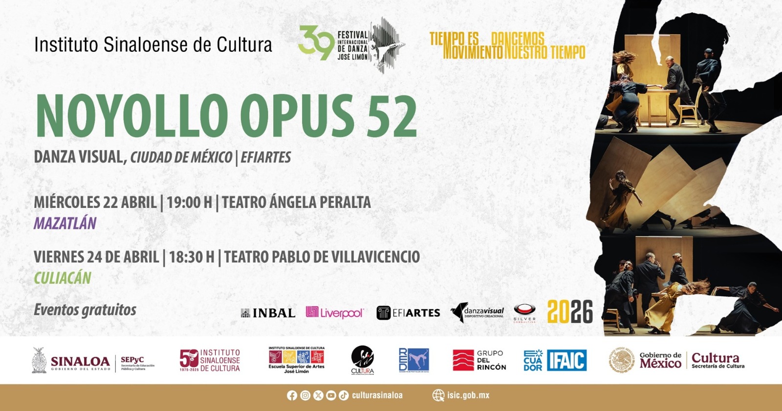 Mazatlán, Sinaloa, a 20 de abril de 2026. — El puerto se viste de gala para recibir una de las celebraciones dancísticas más importantes del país. A partir de las 19:00 horas de este miércoles 22 de abril, el Teatro Ángela Peralta abrirá sus puertas para la inauguración del Festival Internacional de Danza José Limón, iniciando con la puesta en escena “Noyollo Opus 52”.   Entrada gratuita.  Boletos en taquilla del TAP.